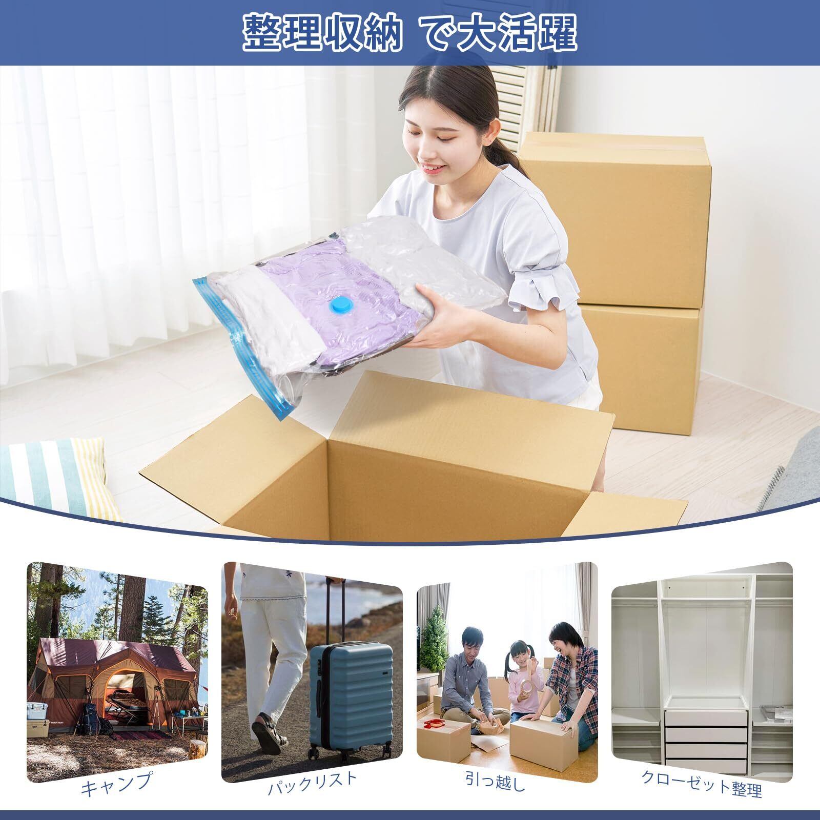 収納スペースを有効に活用:サイズ: 80*100cm四枚入り+60*80cm四枚入り+50*70cm四枚入り+40*60cm四枚入り+35*50cm四枚入り。収納の目安:ダブル/シングルサイズ掛ふとん*1 (80*100cm一枚あたり)。薄手掛ふとん*1、セーター・フリース・パジャマなど合計8枚、コート*8、ぬいぐるみ*2(80*60cm一枚あたり)。夏用掛ふとん*1、Tシャツ*8、トレーナー・パジャマ:各4枚、バスタオル*2(70*50cm一枚あたり)。 スウェット*4 、ジャケット*4(60*40cm一枚あたり)。T-シャツ*15(50*35cm一枚あたり)。布団も衣類もたくさんまとめて収納して、空いたスペースは他の物を入れたり、空間を最大限に活用できます。季節変わり目、コートやセーターなど厚みのあるものが多いので、使わない季節は圧縮して保管出来たら助かります。クローゼットにまとめて収納、複数の衣類をまとめて圧縮し、クローゼット内をすっきりできます。また、旅行や出張時に、数日分の衣類をまとめて、スーツケースやバッグに、省スペースで入れられます。