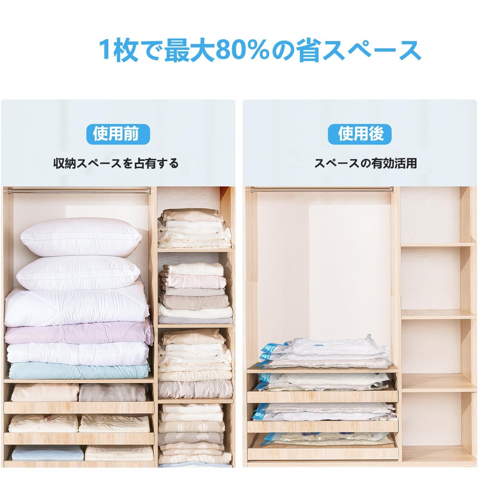 掃除機不要: 手動 圧縮 ポンプ付き 簡単収納専用ハンドポンプ付属で面倒な準備不要。1分で完了する簡単操作で最大80%圧縮可能な省スペース収納袋。マンション・アパートの狭い押し入れにも最適なコンパクト収納ソリューション。スティック掃除機(別売)対応でより強力な真空圧縮も可能