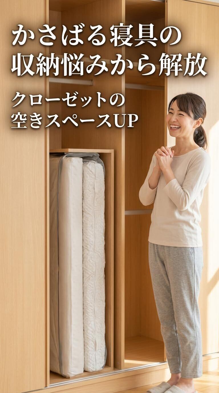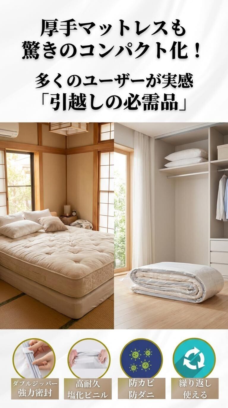 簡単操作: 掃除機やポンプを使って簡単に空気を抜き、コンパクトに収納できます。引っ越しの時にも荷物をコンパクトにできて便利です。