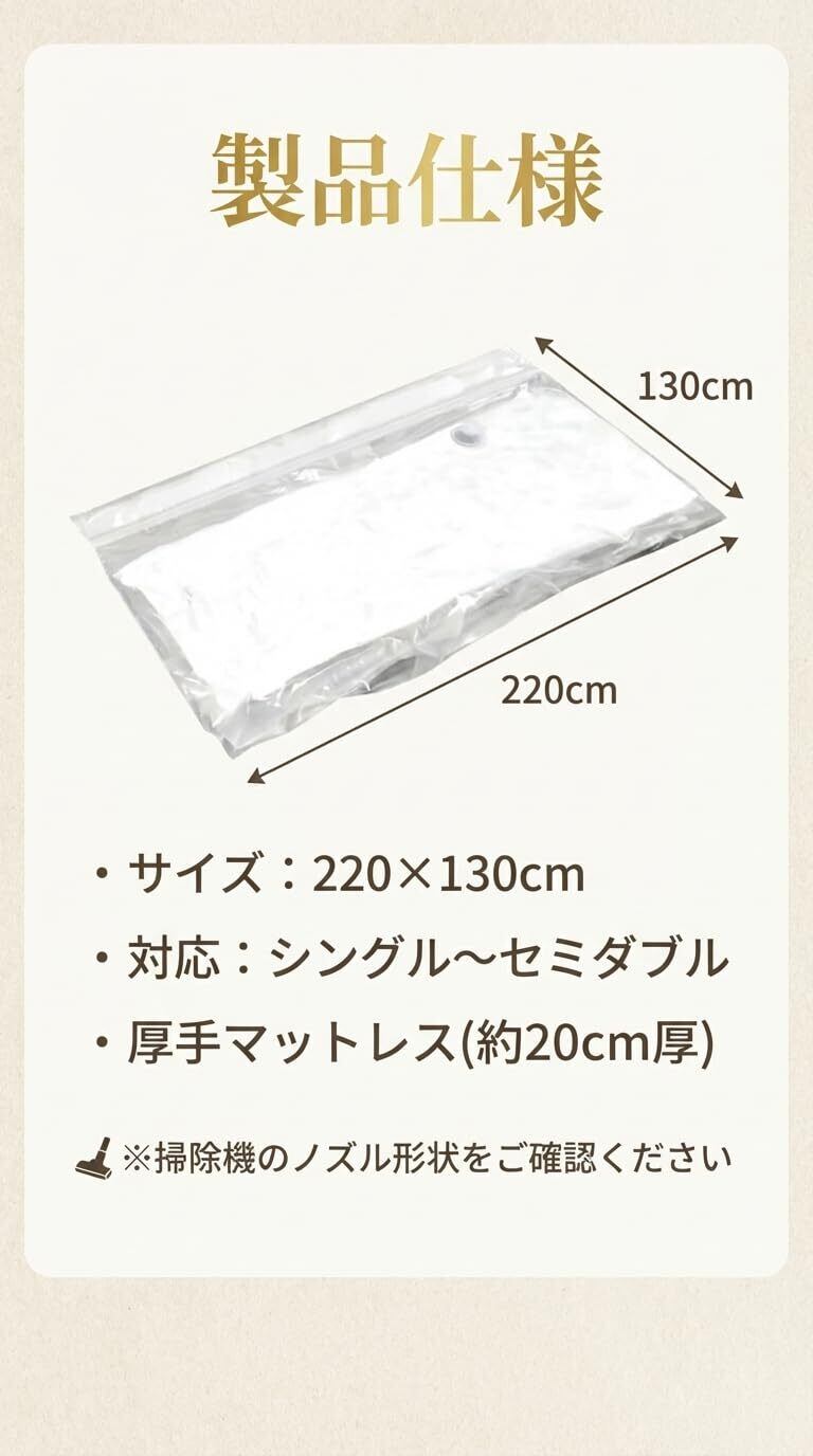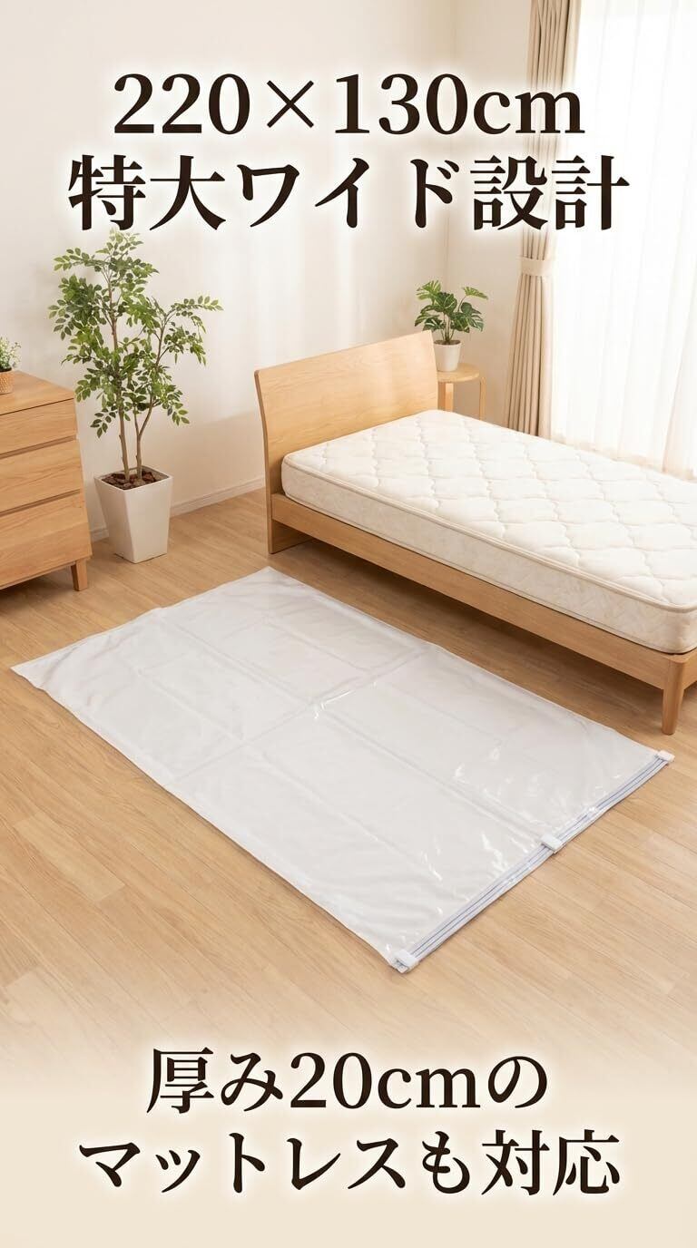 大容量設計: 特大サイズ(220×100cm or220×130cm)の圧縮袋なので、布団やマットレスなど大きなアイテムもラクラク収納できます。