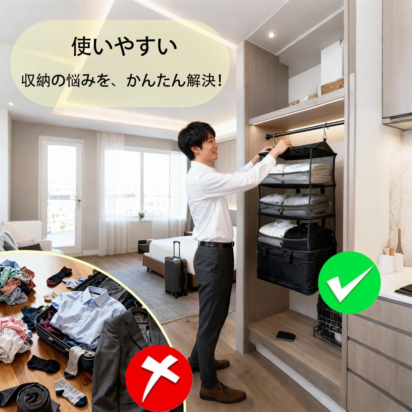 【圧縮できる、どこでも使える収納バッグ】 コンパクトに圧縮できるため、旅行や出張の荷物にかさばらず、収納に便利です。サッと広げてハンガーやフックに掛けるだけで、ホテルや浴室、学生寮など、どこでも即席の収納スペースが完成。様々なシーンで、あなたの生活を快適にサポートします。