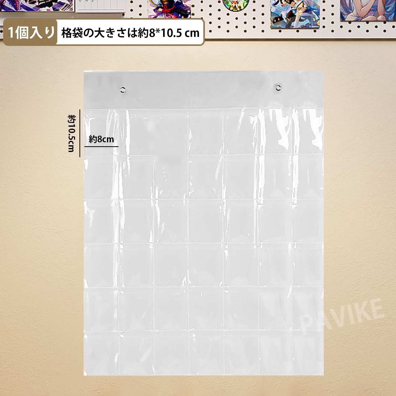 【商品仕様】サイズ:約74cm*56.5cm、個別ポーチサイズ約10.5*8cm(10.5*7cmまでのカードに対応)、カラー:透明、数量:42収納ポケット*1+フック*2。( ご購入前にカードサイズをご確認ください)。
