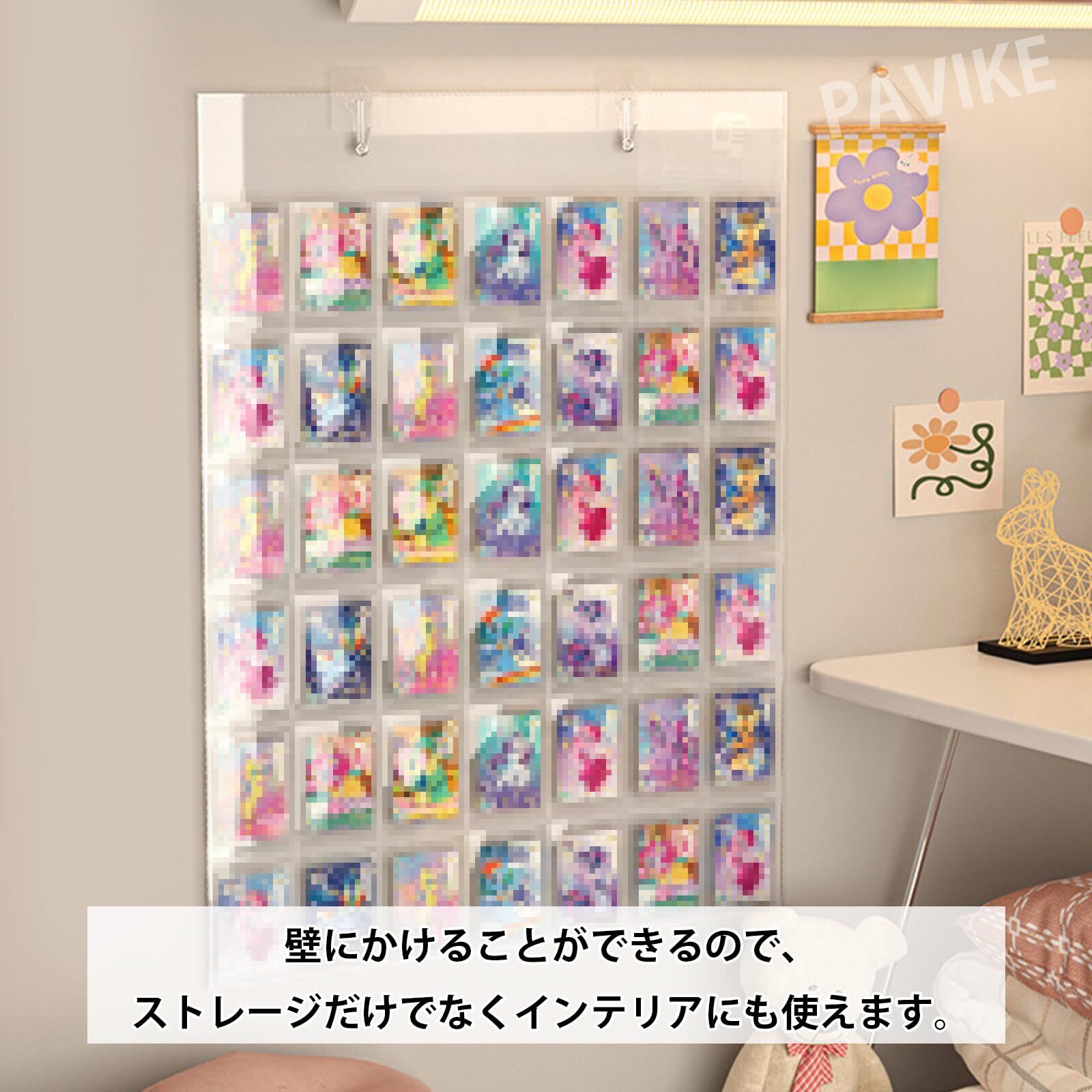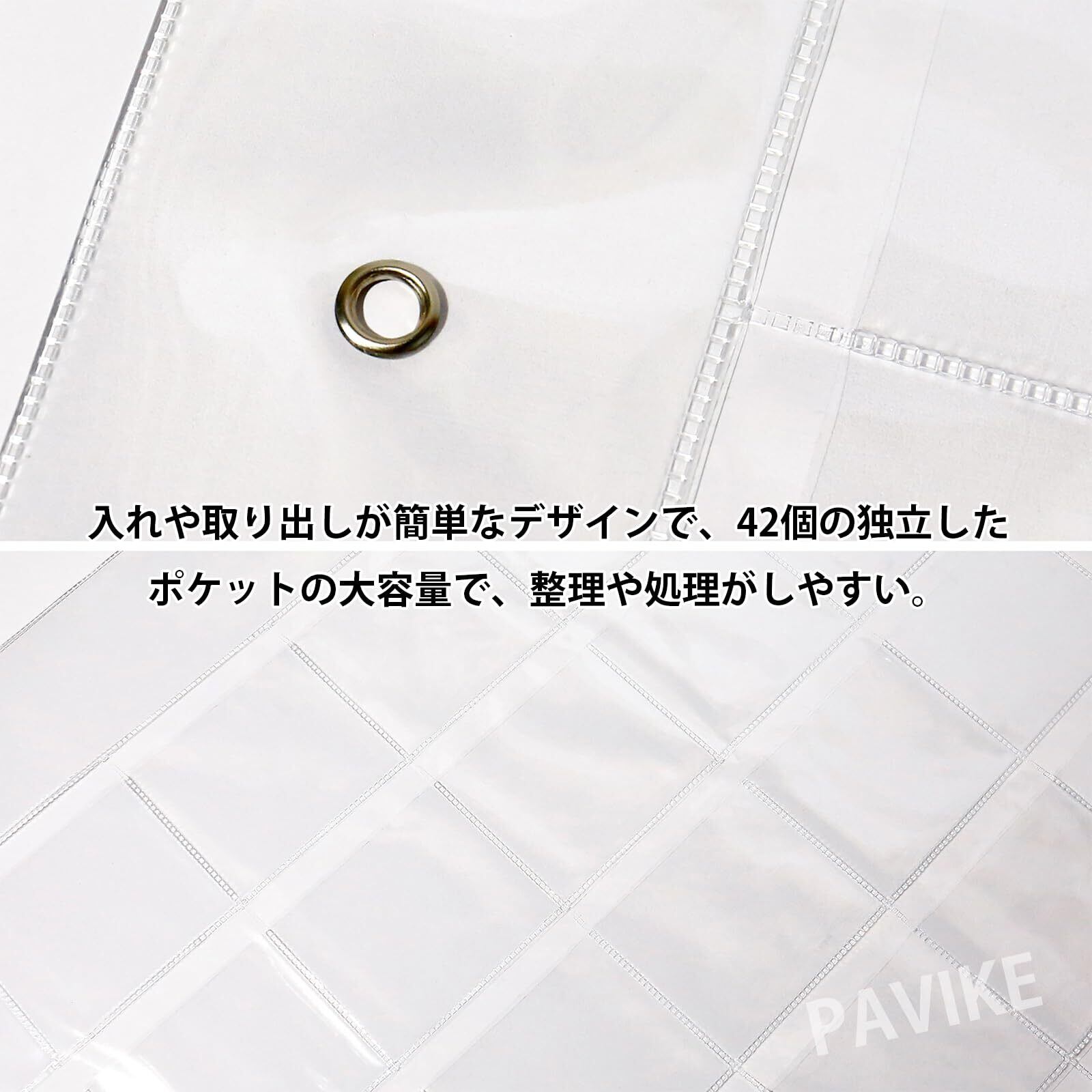 【数量限定】PAVIKE カードホルダー 壁掛け (42ポケット) 写真展示用ホルダー ポストカード 収納 壁掛式 ウォールポケット 42枚のカードを収納可能鑑賞 透明 カードの保護 傷防止 吊り下げ 大容量 省スペース 10.5cm*8cm以内に対応 フック付き