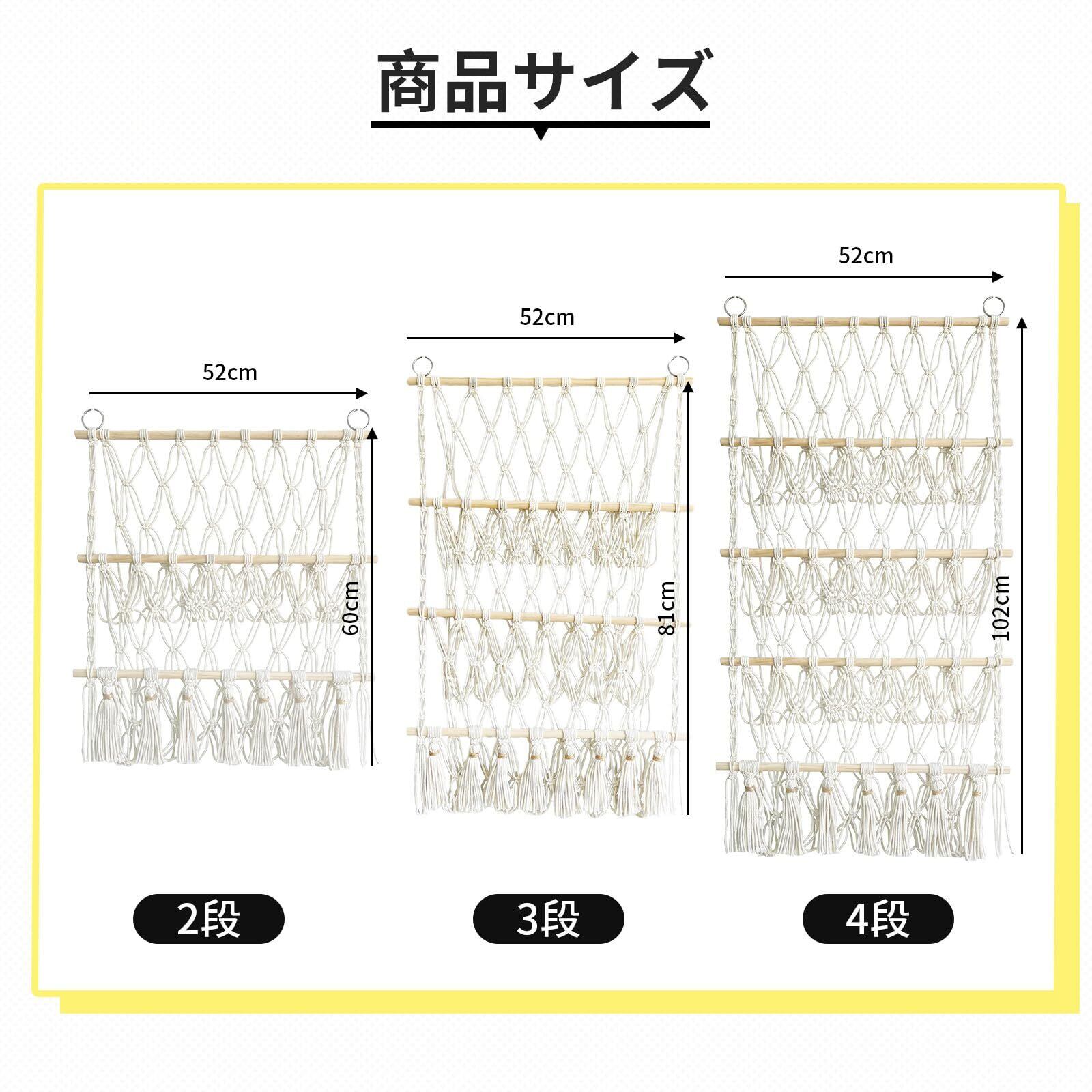 ぬいぐるみ 収納 ウォールポケット ぬいぐるみ ハンモック マクラメ壁掛け 大容量 子供部屋・リビング・ベッドルーム 無痕フック付 簡単設置 省スペース (白4段:52cm×102cm)