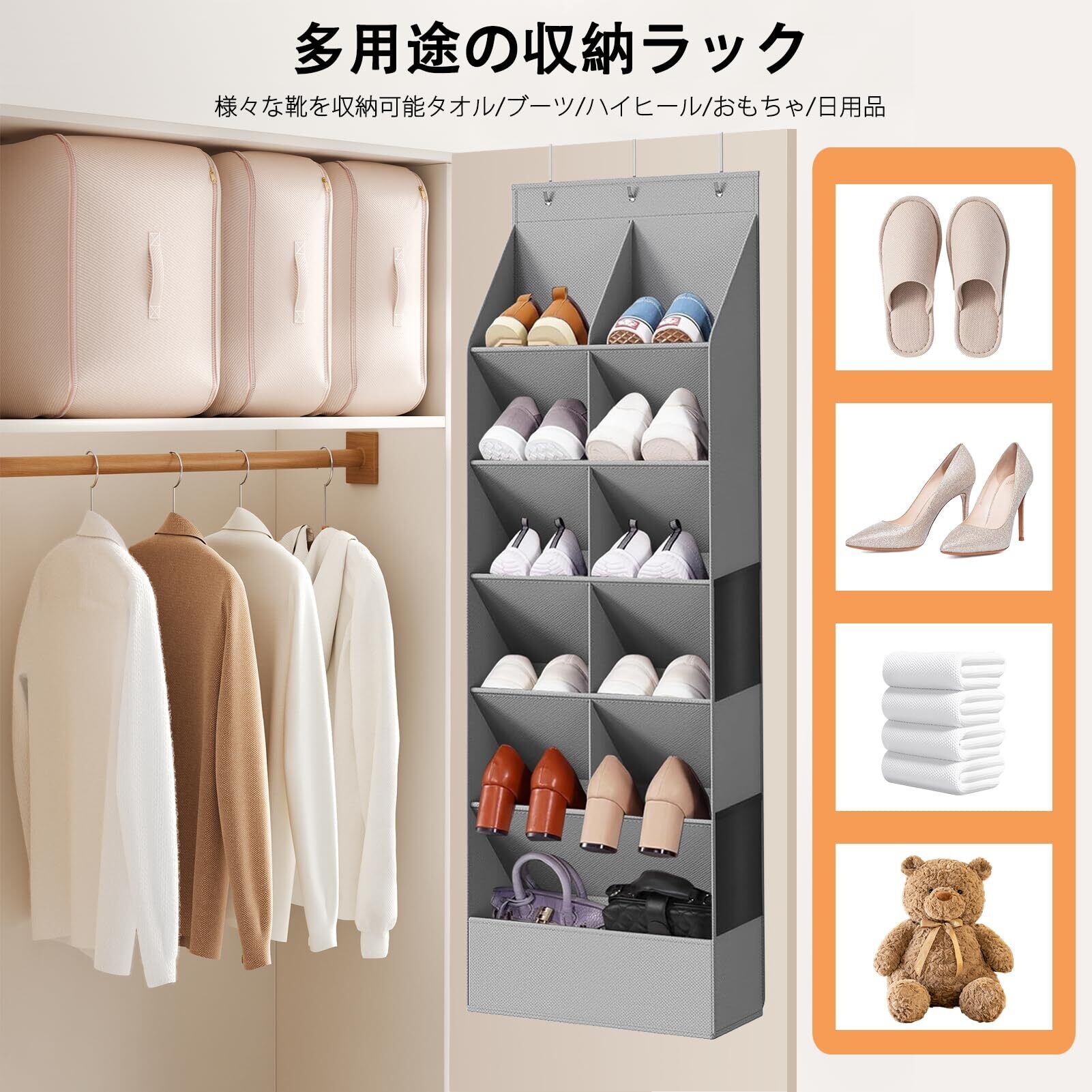 FYY ウォールポケット 壁掛け収納 6段 大容量 靴収納 折りたたみ式 突っ張り 吊り下げ ドアバックシューズラック 組立不要 収納ラック 不織布 頑丈 省スペース フック3個付き 玄関 寝室 パントリー ぬいぐるみ おもちゃ 下着 靴下 シューズラック(グレー)