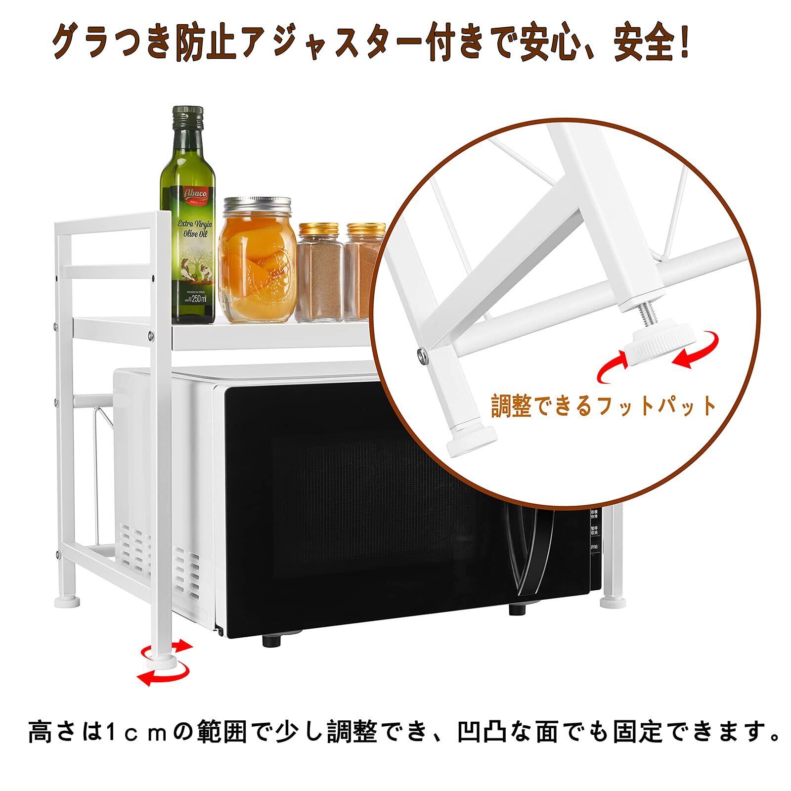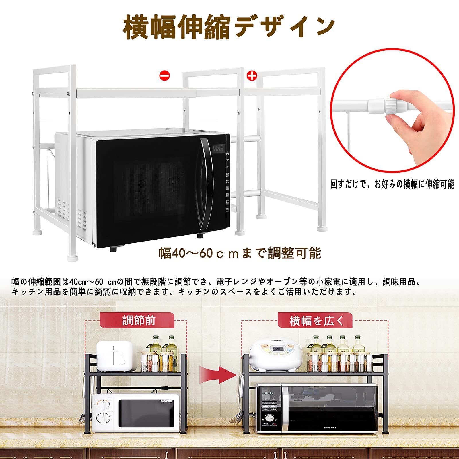 【高さ2段階調節可・幅伸縮式】収納ラックの幅の伸縮範囲は40cm~60 cmの間で無段階に調節でき、可動棚板は約5.5cm間隔で2段階で高さ調節可能で、使い勝手がとても良いです。電子レンジやオーブン等の小家電に適用し、調味用品、キッチン用品を簡単に綺麗に収納できます。キッチンのスペースをよくご活用いただけます。
