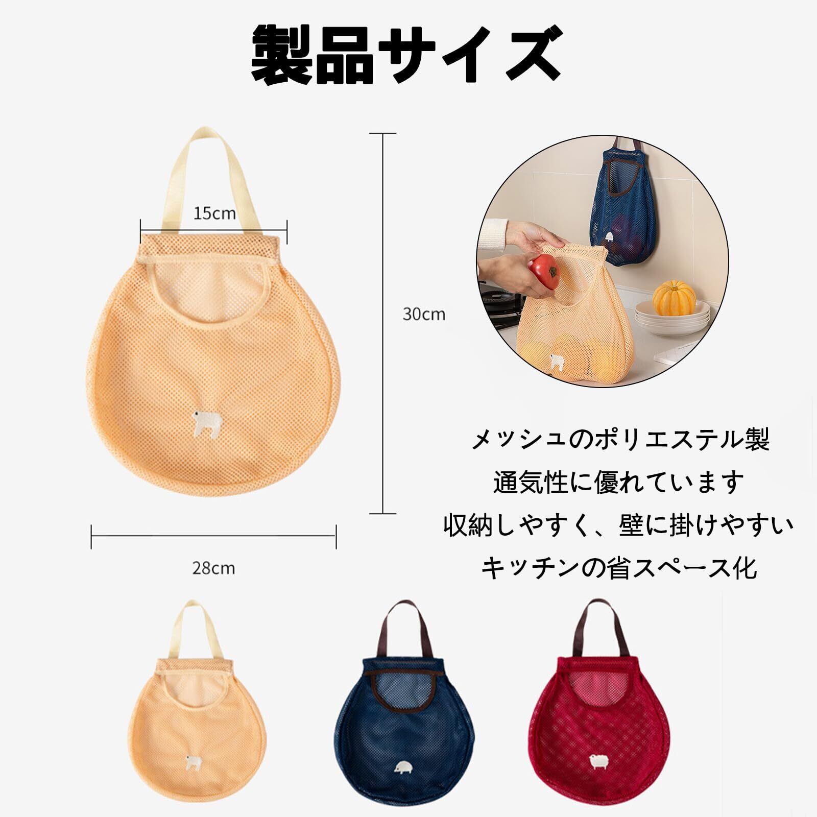 【パッケージ内容】サイズ:28*30*15cm、カラー:イエロー、レッド、ブルー。野菜ストッカーは、通気性の良いポリエステルメッシュ素材を採用しており、引っ張りに強く、通気性抜群で、食材の鮮度をしっかりと保護します。果物や野菜、雑貨などを収納するのに最適で、壁に掛けることでキッチンのスペースを効率よく節約できます。