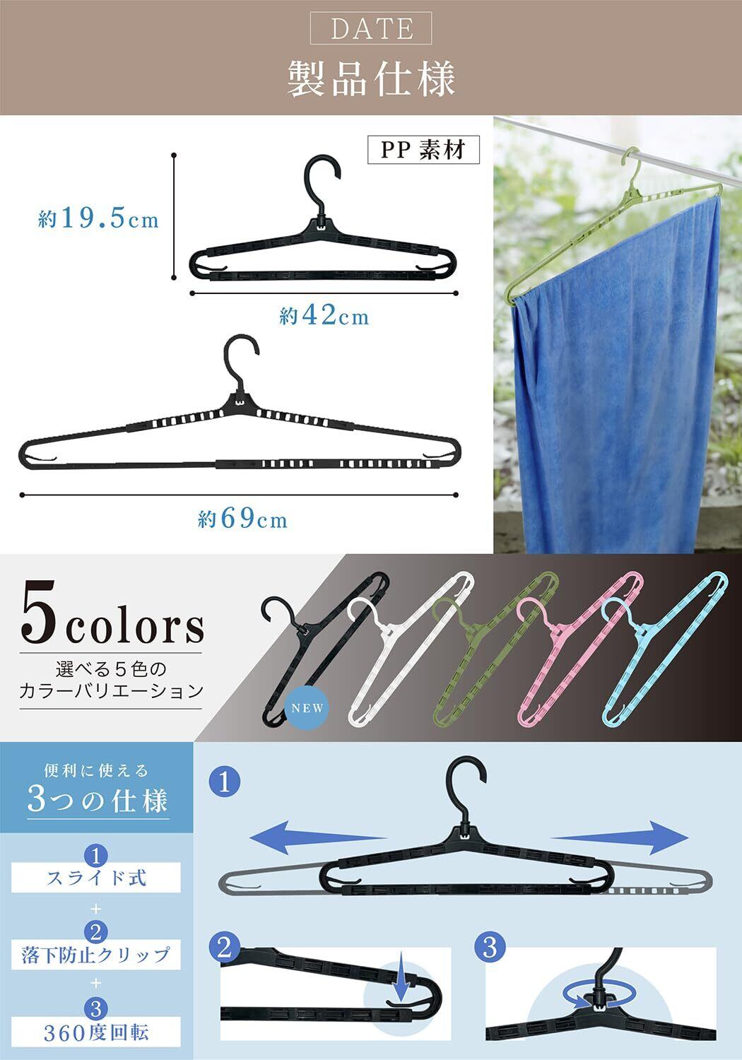 【素材】丈夫なプラスチック素材を使用して、紫外線に強く、変形しにくい、長期的にお使いいただけるような設計のバスタオル洗濯ハンガーです。2本セットでシーツ等も干すことが可能です。
