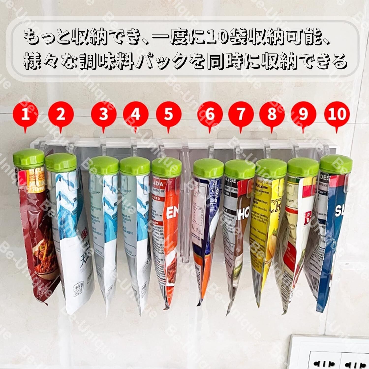 袋止めクリップ 調味料収納ラック スパイスラック 壁掛け 粘着式 省スペース コンパクト キッチン収納ラック 調味料入れ 調味料ポット 防水 防湿 強力粘着 お手入れ簡単 台所収納 家庭用 業務用 キッチン整理整頓に最適 (透明,10穴) [並行輸入品]