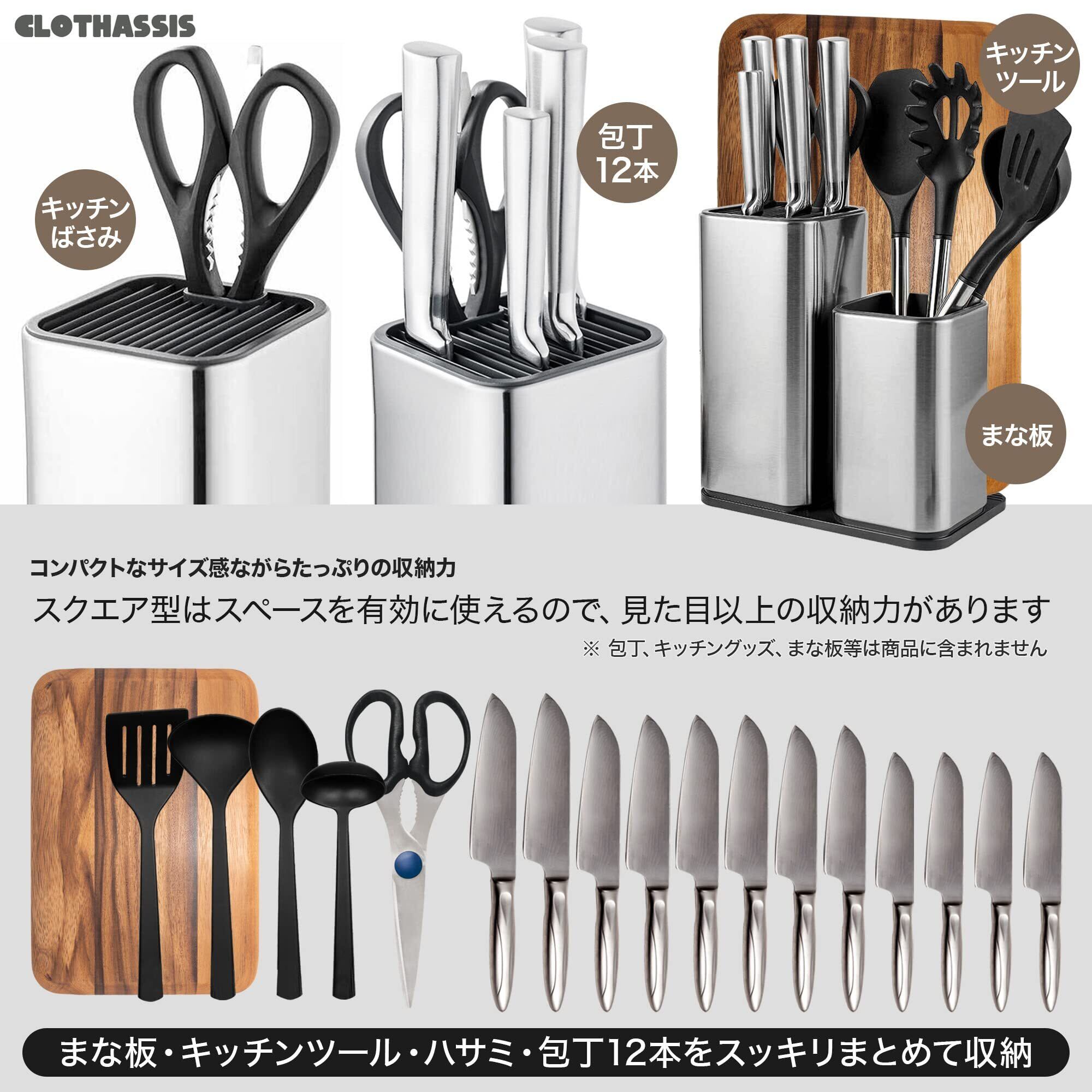 【収納力抜群のキッチンツールスタンド】まな板のスタンド、包丁のスタンド、調理ツールスタンドの機能を兼ね備えたキッチンツールスタンド。包丁12本、まな板、キッチンばさみ、フライ返し、おたまなどの調理ツールをまとめて収納できます。抜群の収納力でキッチンをスッキリと整理整頓。使いたいときにサッと取り出せるので、調理の効率もアップします。