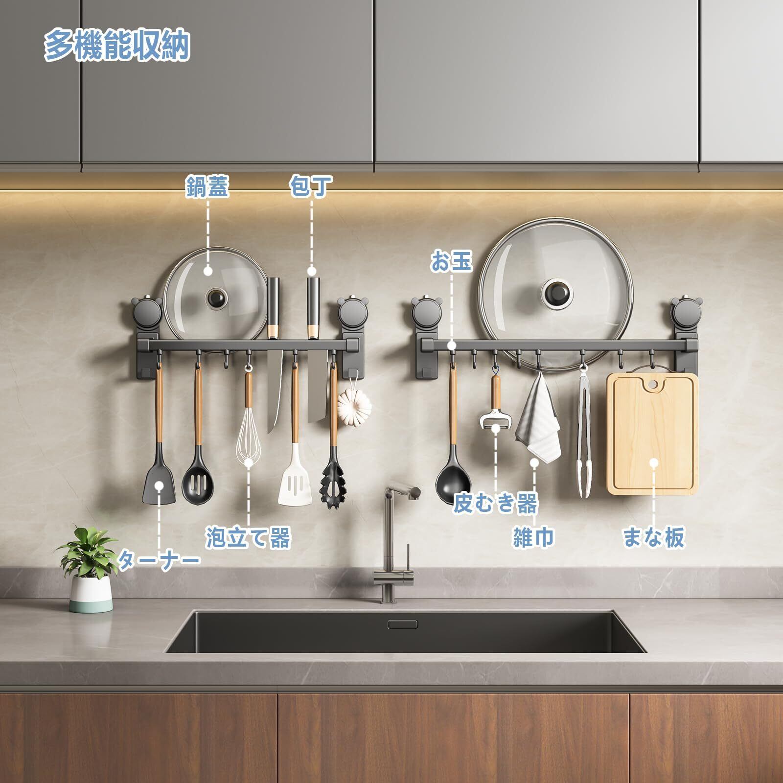 【防水防錆】のキッチンツールフックはアルミニウムとABSで作られます。このキッチン フックは長持ちで、錆びることがありません。油や水がついても、滑らかな表面を保ちます。 キッチンなどの濡れた環境下でも安心してお使いいただけます。