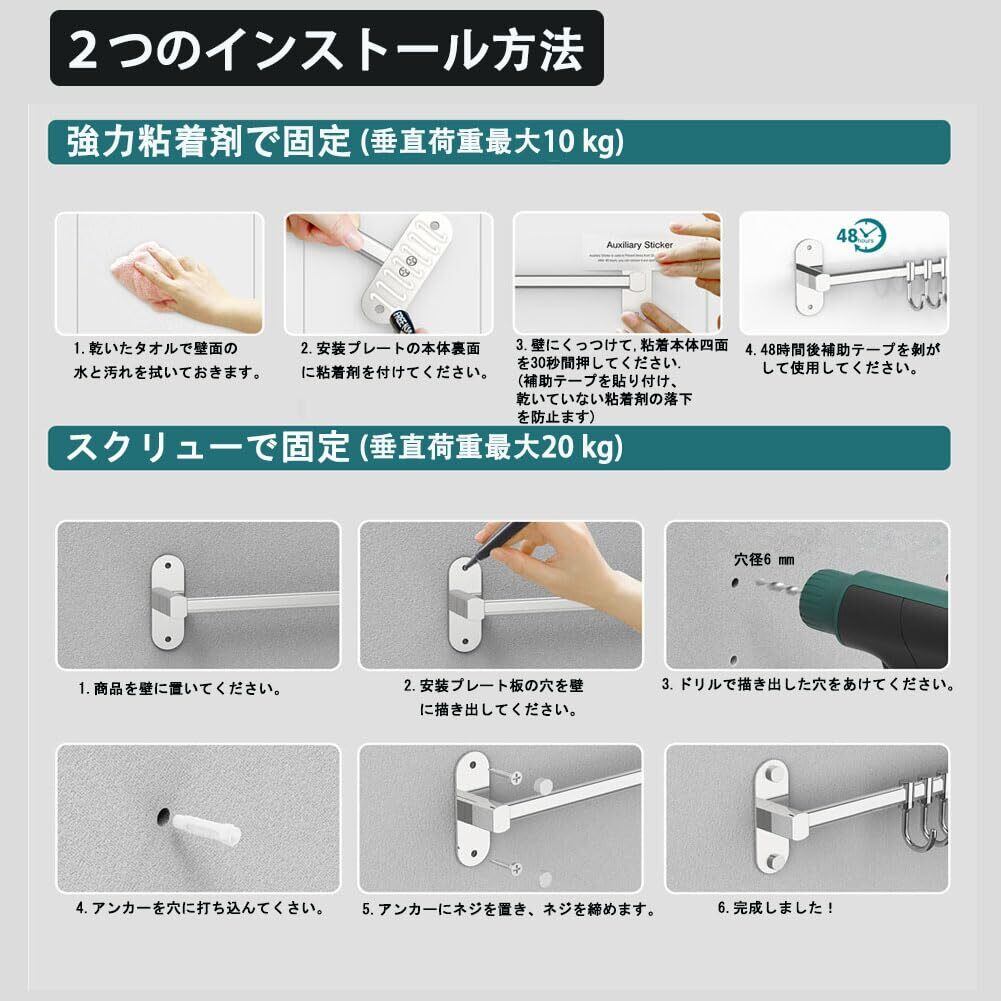 超強力の接着剤で取り付けることにより、キッチンツール収納, 鍋蓋収納, フライパン 吊り下げ, 鍋収納など. 粘着剤固定場合垂直荷重最大10 kgの物体を吊り下げることができ, ネジで固定場合20kgまでいっぱいキッチンの調理器具をちゃんと整理できます.どちらのインストール方法でも荷重にご安心使用してください。