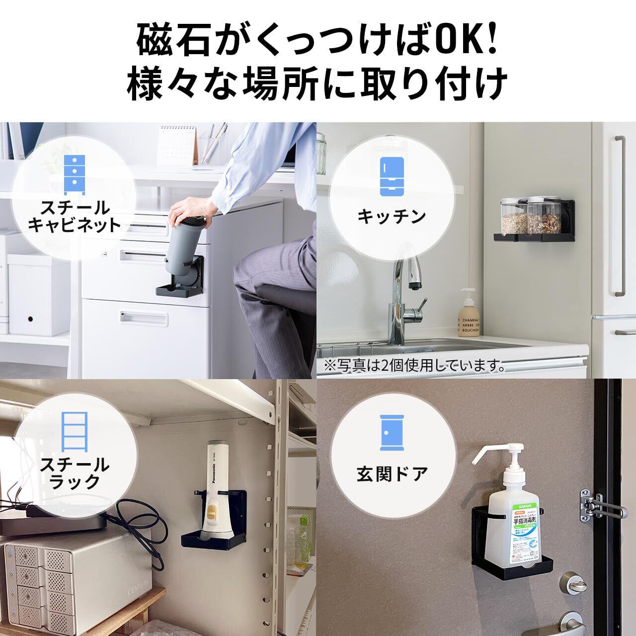 磁石 で収納キャビネットや玄関扉に貼り付きます。