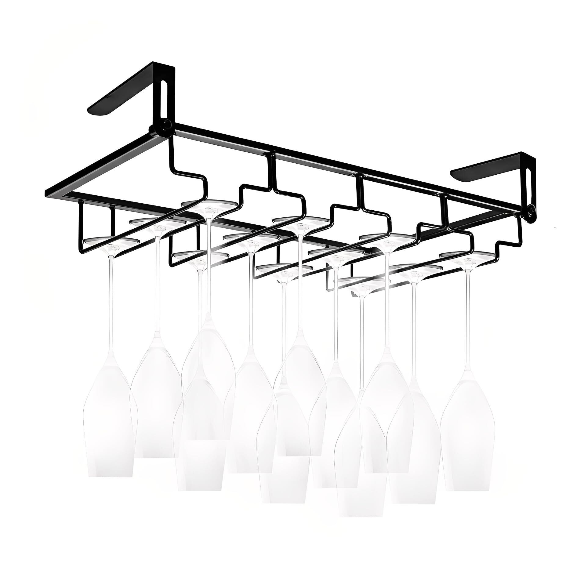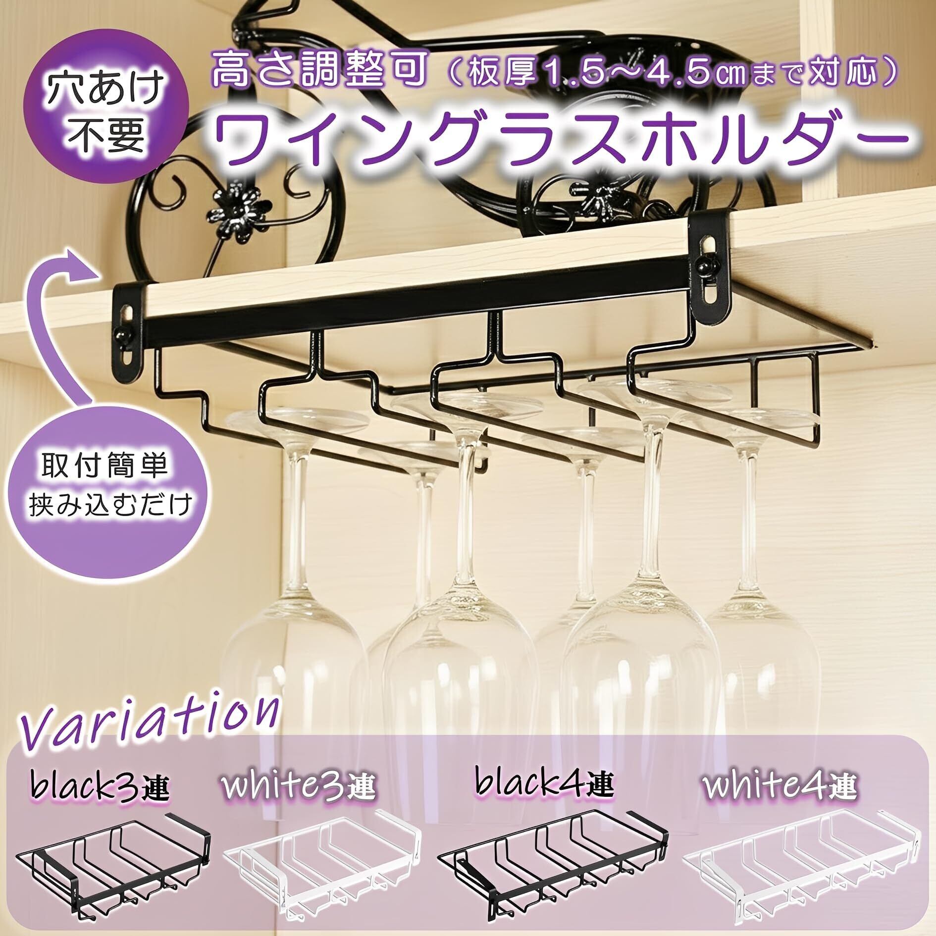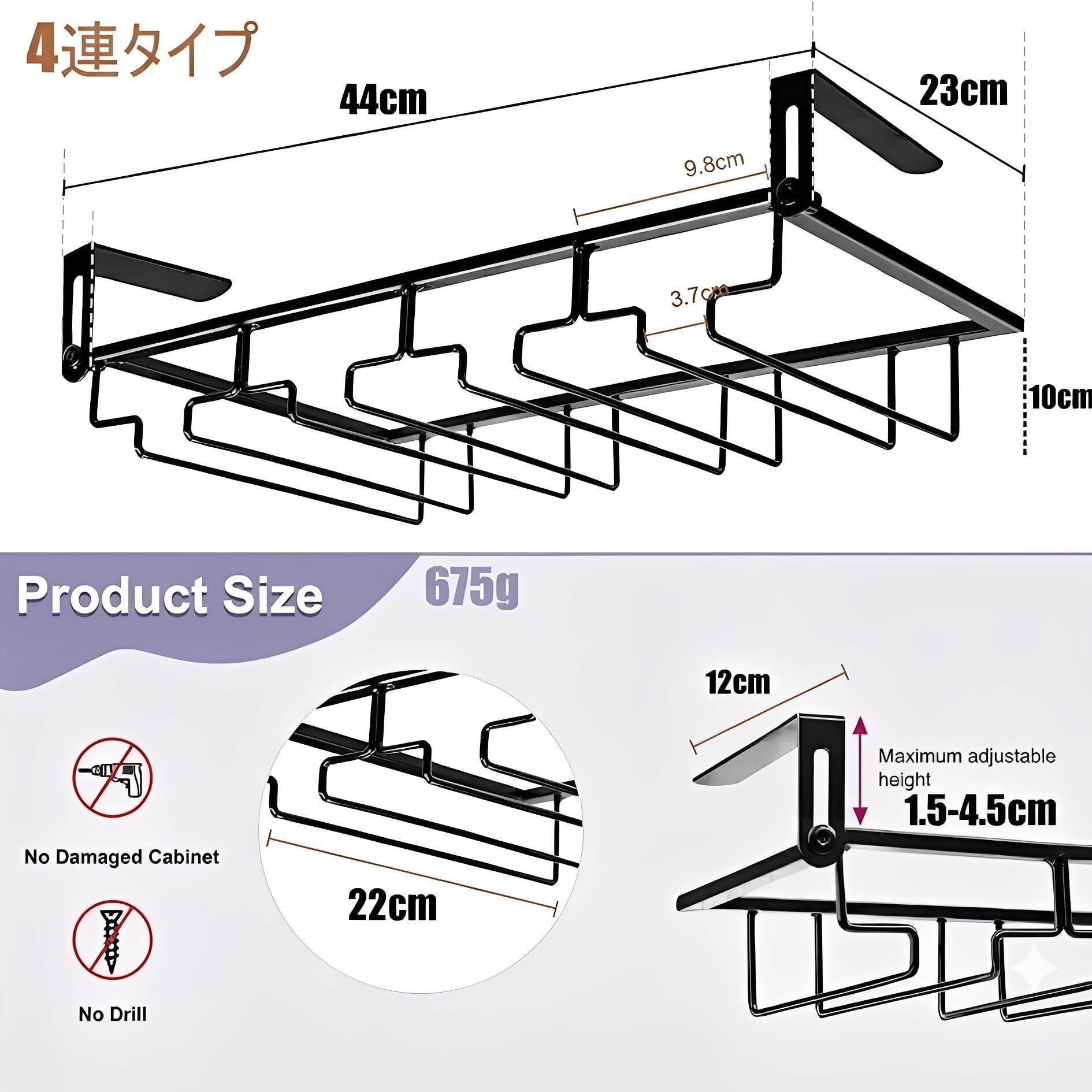 ワイングラスホルダー 高さ調整可能 吊り下げ 2列 収納 穴あけ不要 簡単取付 ネジ止め対応 グラススタンド キッチン シャンパン ワイン (ブラック4連)