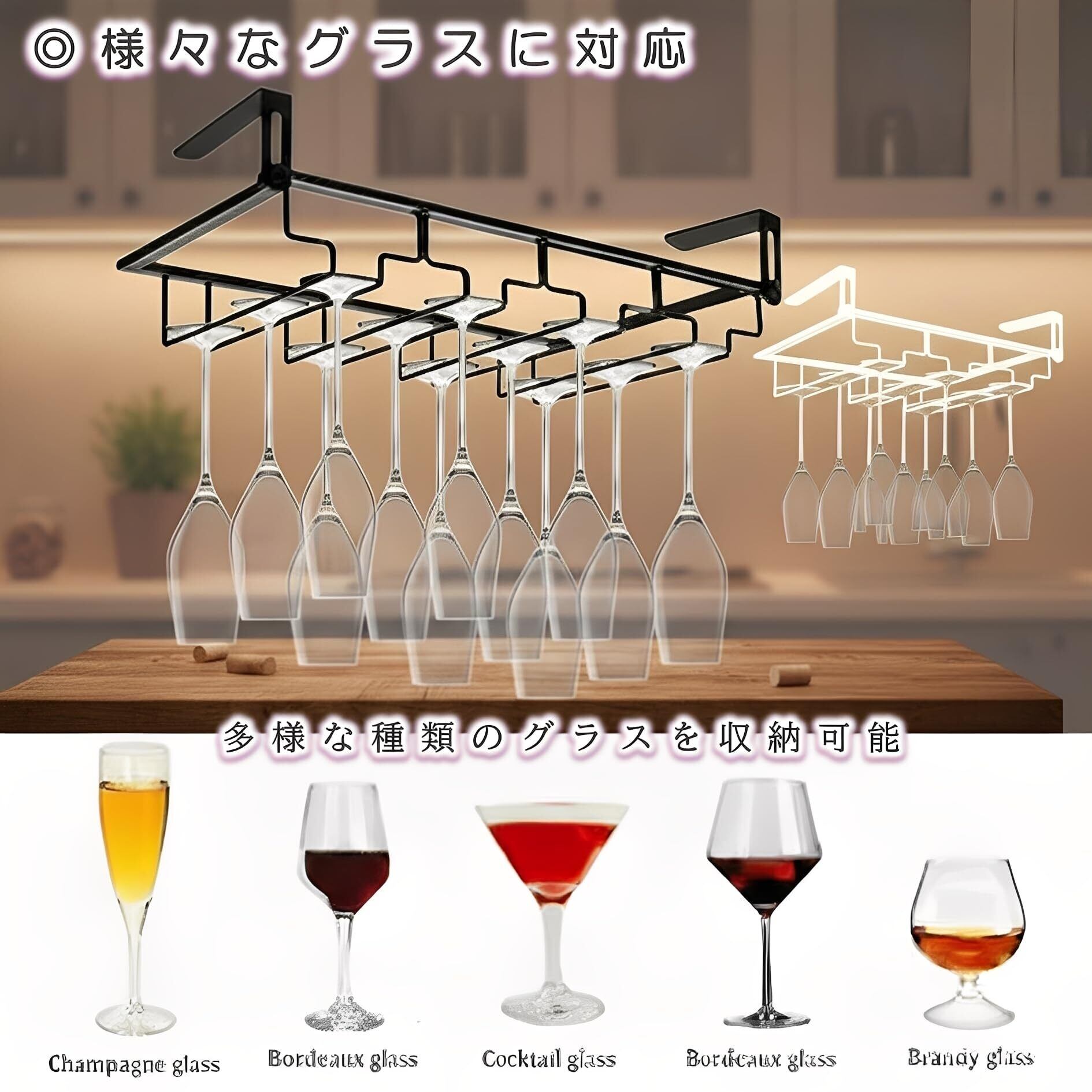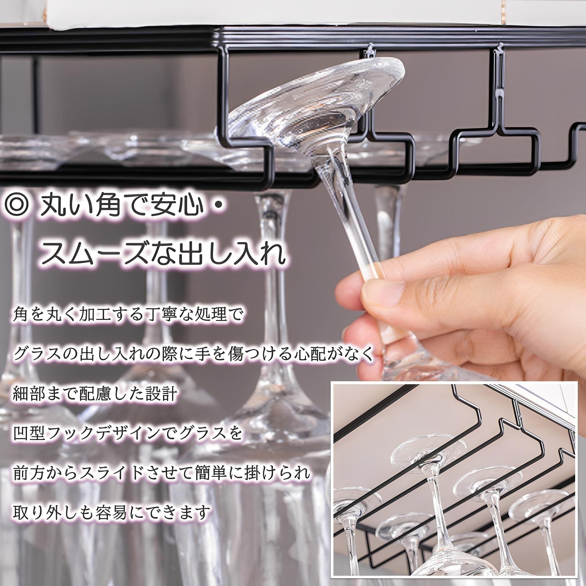 ◎安心の製品設計と機能強力な耐荷重性(強固で安定): 頑丈な構造でグラスをしっかり保持。滑り落ちる心配なく安心して収納できます。科学的な力学構造と太い鉄線を使用し、耐荷重性が強化されています。錆びにくく、耐久性の高い焼き付け塗装処理済み。◎丸い角で安心・スムーズな出し入れ:角を丸く加工する丁寧な処理が施されており、グラスの出し入れの際に手を傷つける心配がありません。細部まで配慮した設計です。 凹型フックデザインで、グラスを前方からスライドさせて簡単に掛けられ、取り外しも容易です。