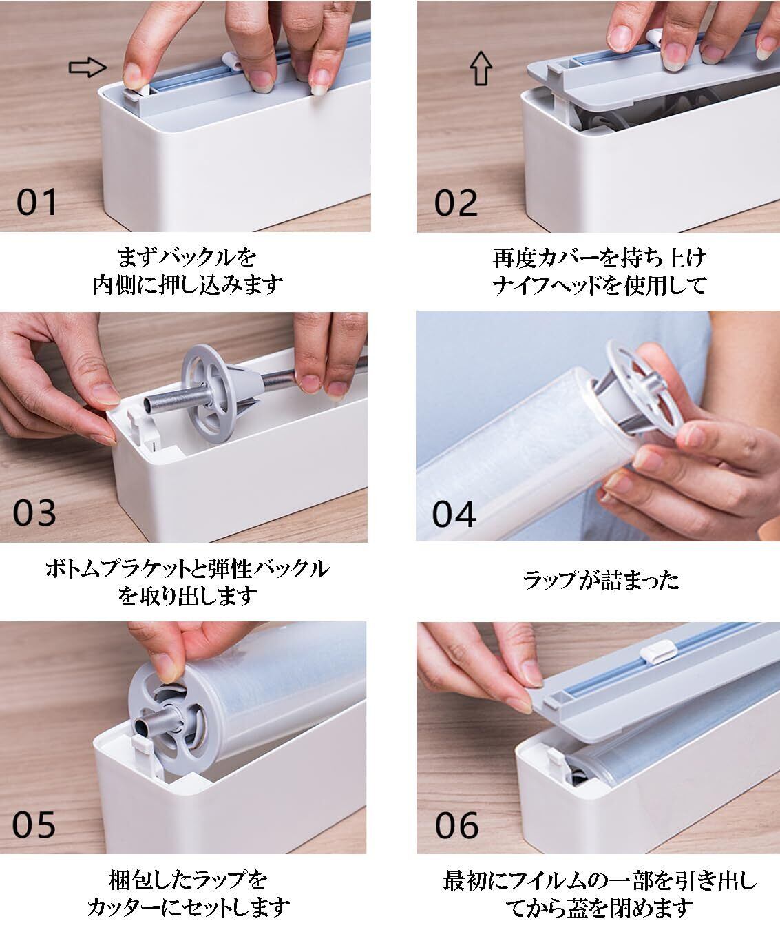 【特別なデザイン】スライド式カッターを搭載している為、ラップをスムーズにカット、かつ安全に使用出来ます。ハサミの使用など面倒な作業は不要です。更に便利な溝付き構造によりラップをすばやく引き出せ、次回分も綺麗に残せます。弾力性のあるバックル設計で、切り残しのラップにも柔軟に対応。食品用ラップとしてはもちろん、ホイルや包装紙のカットにも適しています。コンパクトで安全性にも優れており、置き場所を選ばず使えるのも魅力の1つです。