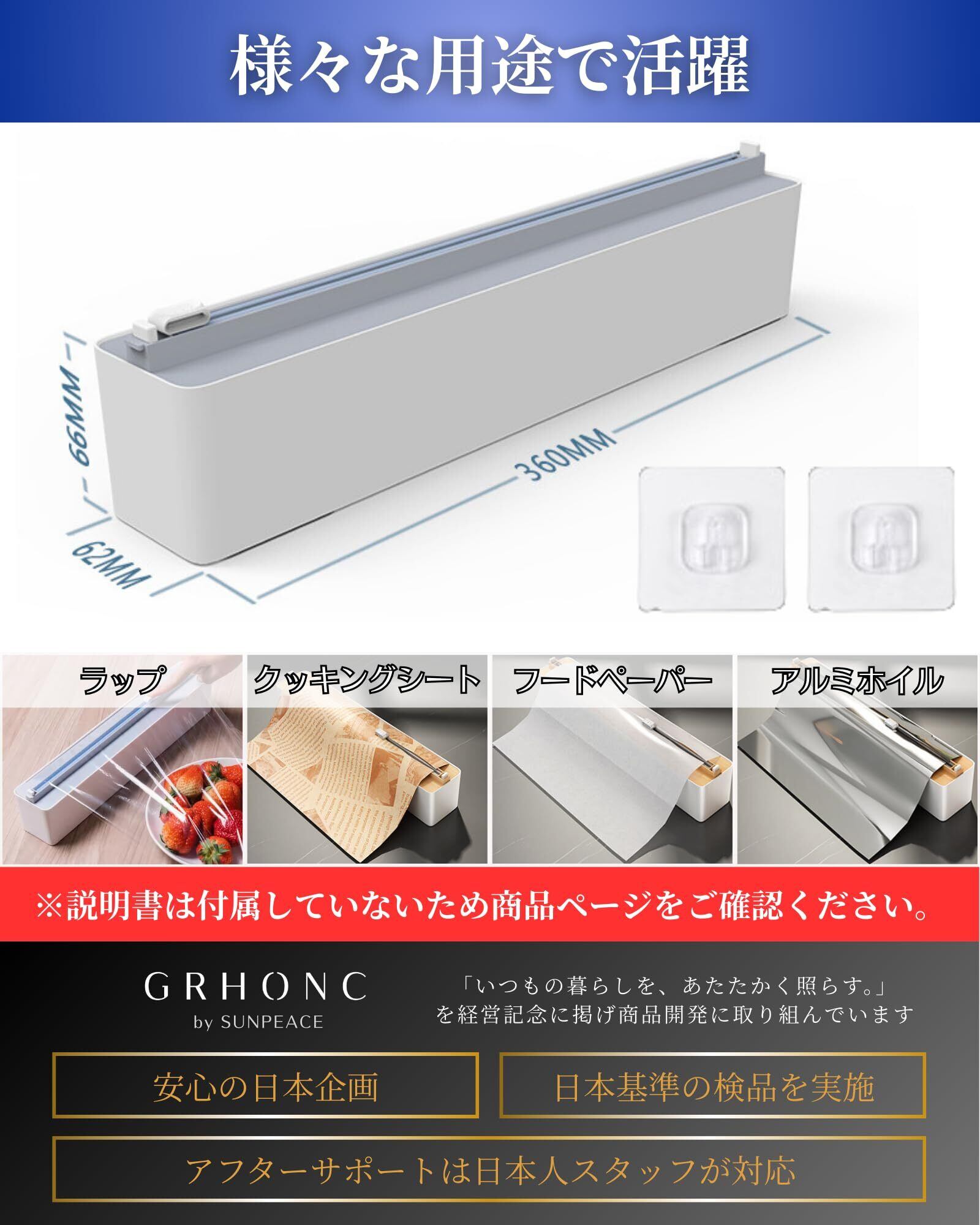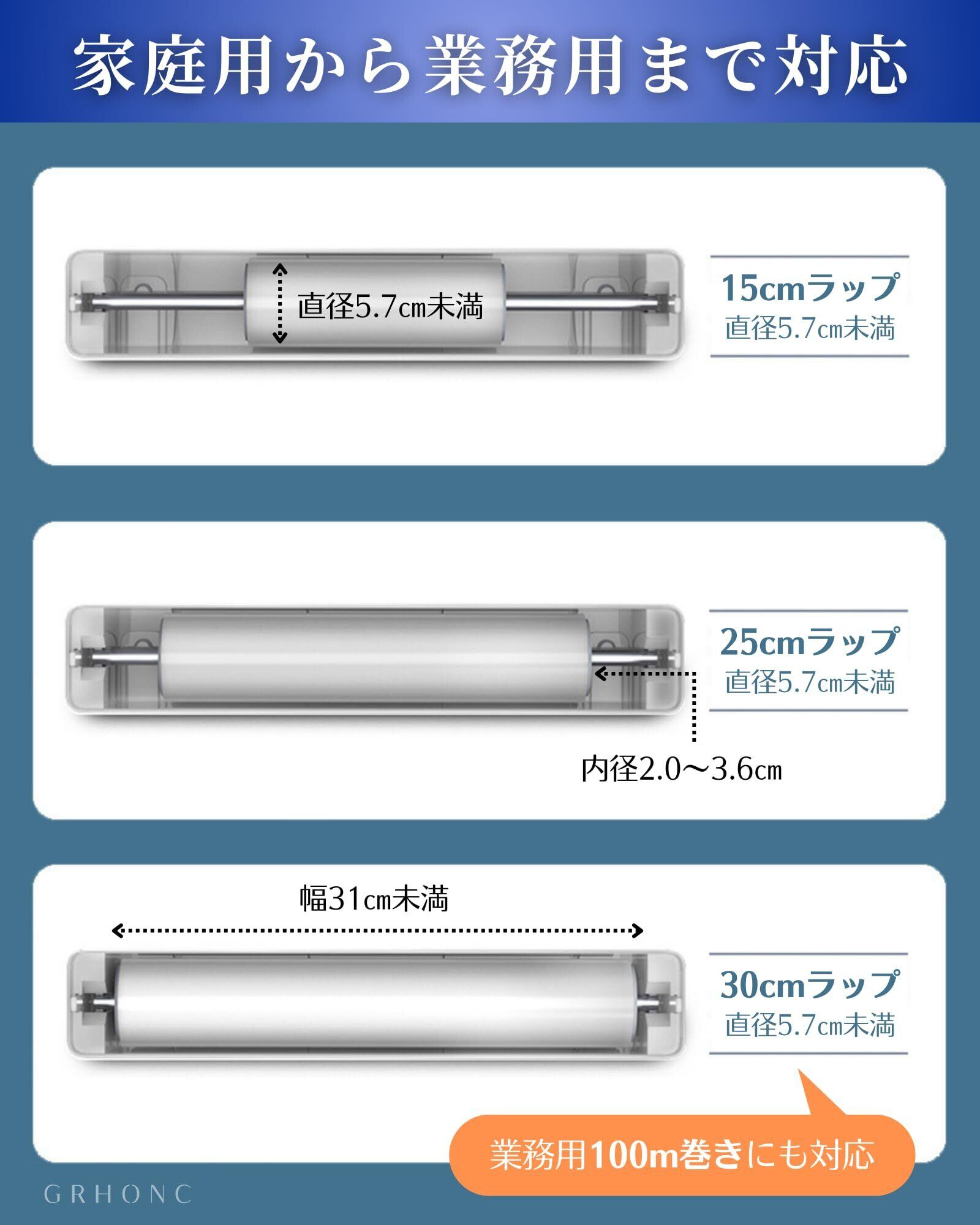 【最大31cm幅対応・業務用100mラップもOK】家庭用から業務用まで幅広く対応。内径2~3.6cm、直径5.7cm以内のラップロールに対応し、お好みの長さで調整可能。大容量ラップも使えるので、頻繁に料理する家庭やお店での使用にも最適です。