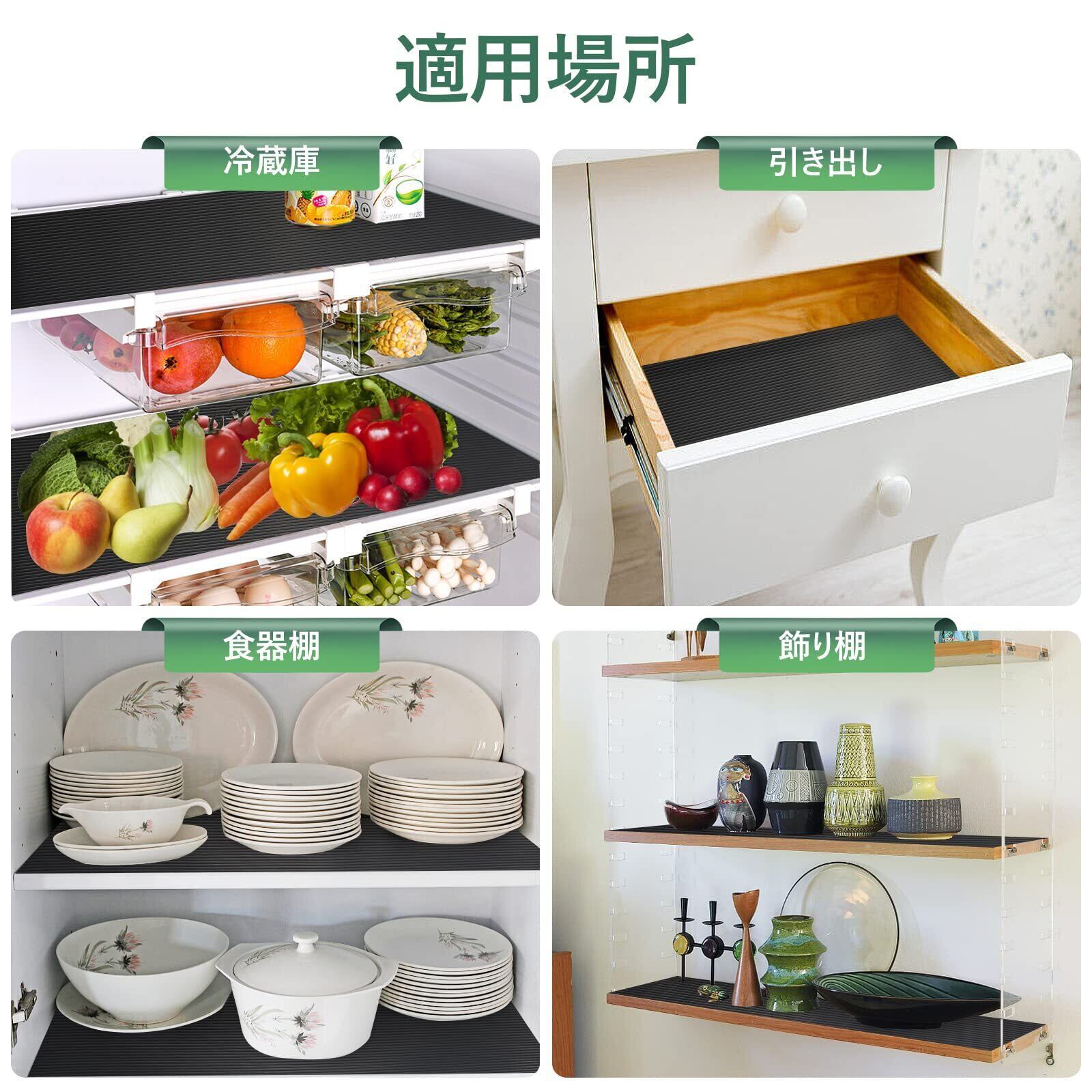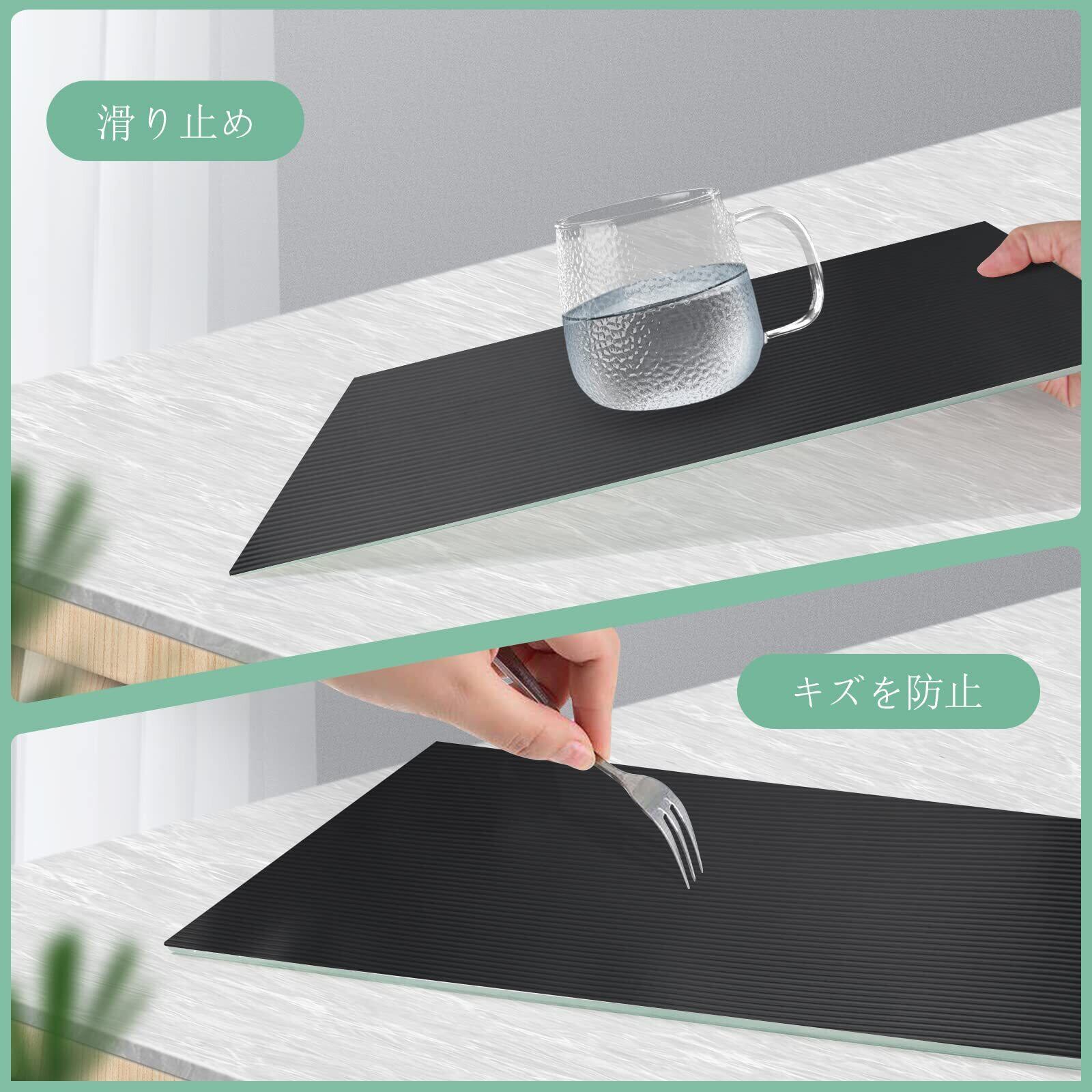 「直接触れる、安全・無害」:食器棚シートは、BPAを含まない食品用EVA素材で作られていて、人体には無害です。商品は耐久性があり、-50℃~90℃の温度でも変形しません。クッション性も高く、事故防止だけでなく、引き出しや冷蔵庫、テーブルの上やカウンターに傷がつくのを防ぐことができます。
