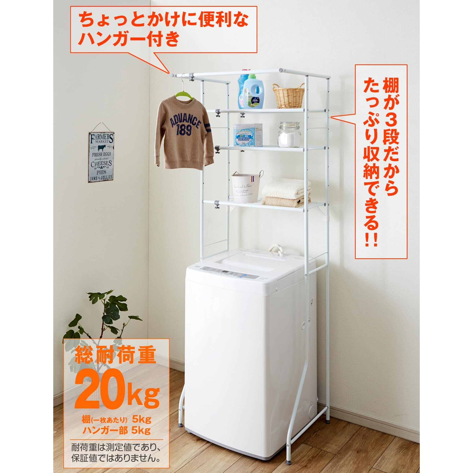 【特徴】3段棚でたっぷりと収納できます。幅は伸縮式なのでいろんなサイズの洗濯機に対応できます。