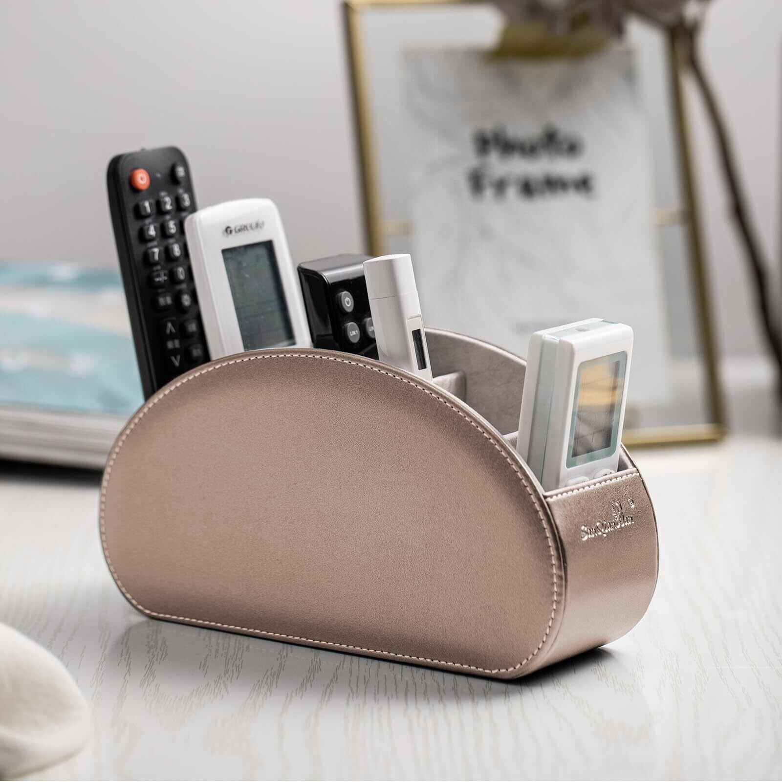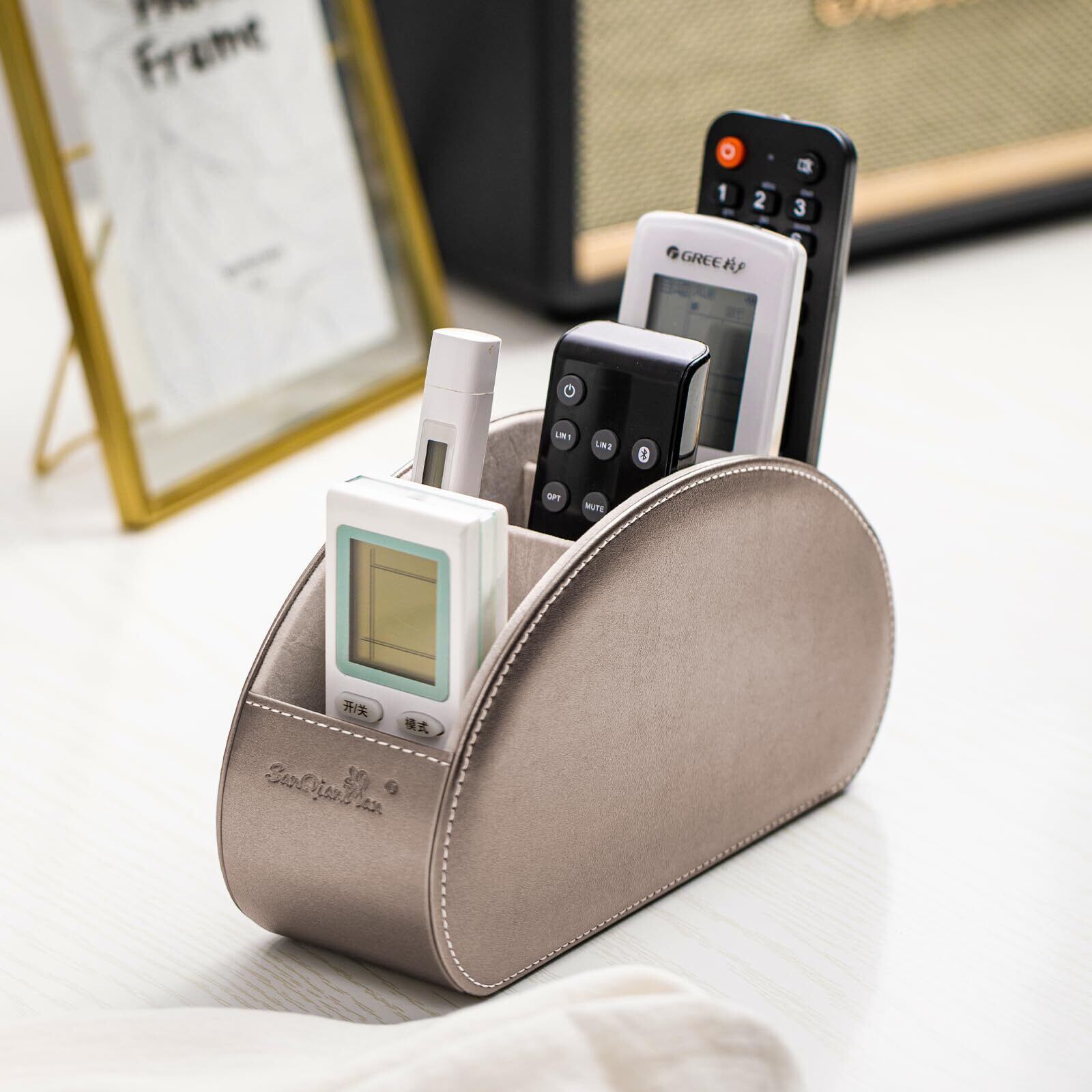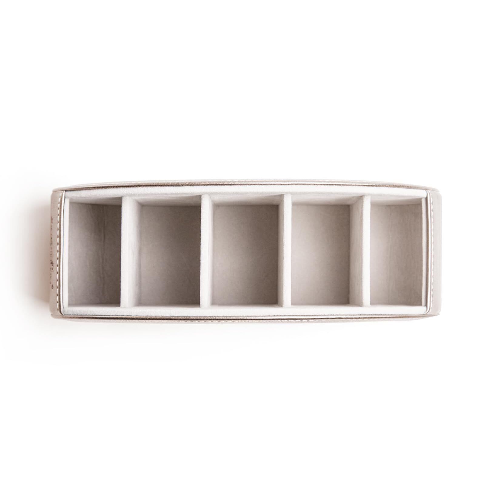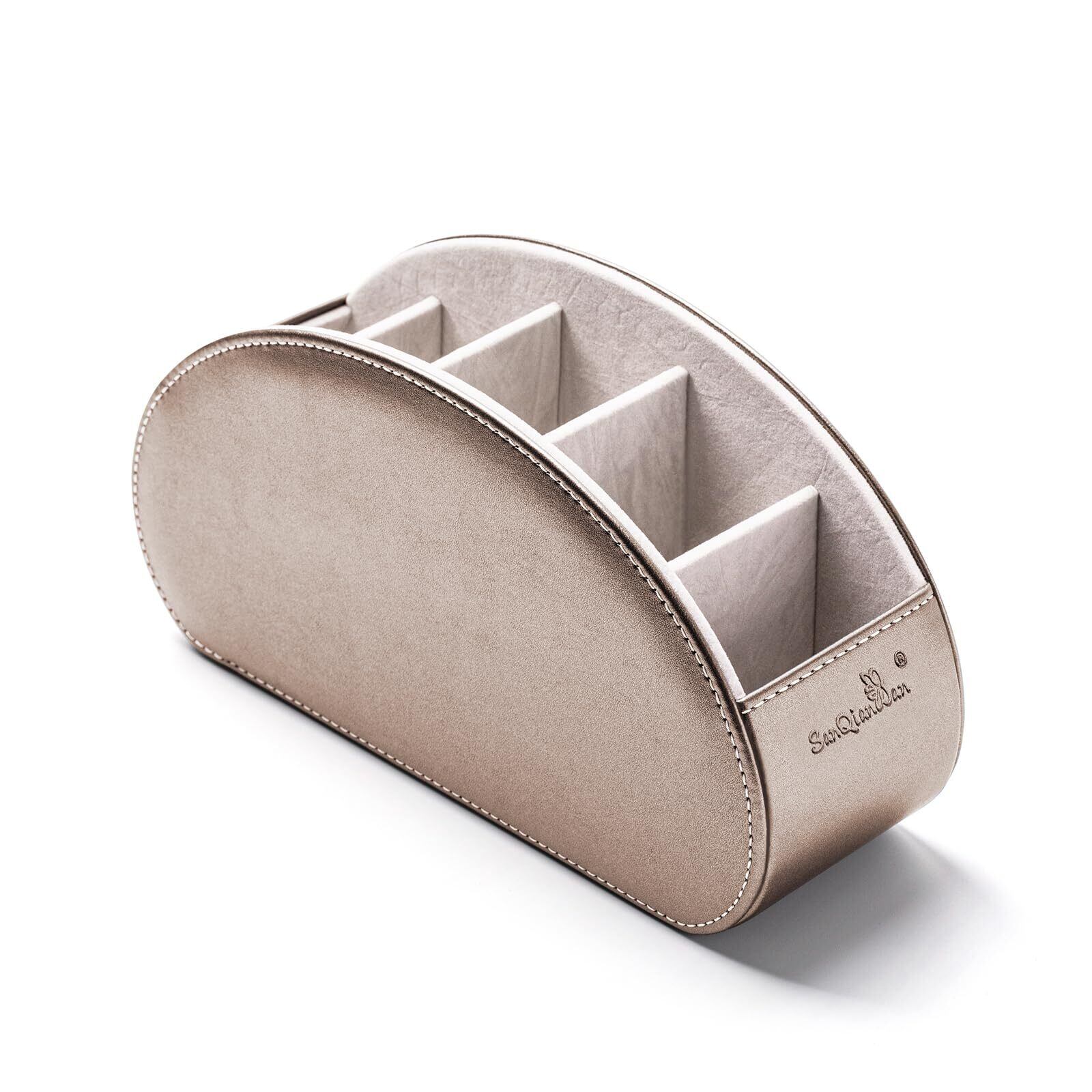 リモコンラック PUレザー リモコン収納 テーブル 5格仕切り リモコンスタンド おしゃれ 防水 多機能収納ボックス 文房具 卓上小物 (シャンパン, ライト)