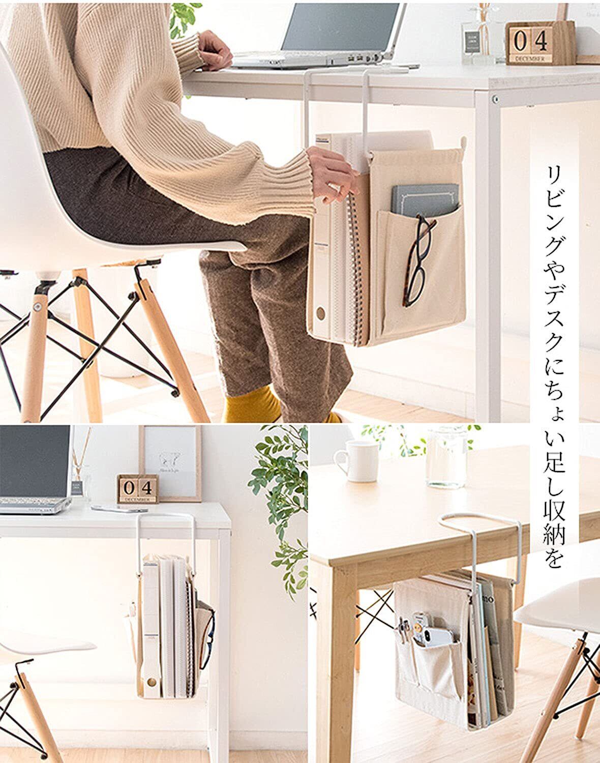 ダイニングテーブルやデスクに引っ掛けるだけで新聞や雑誌が収納できる帆布ケースのハンギングラック