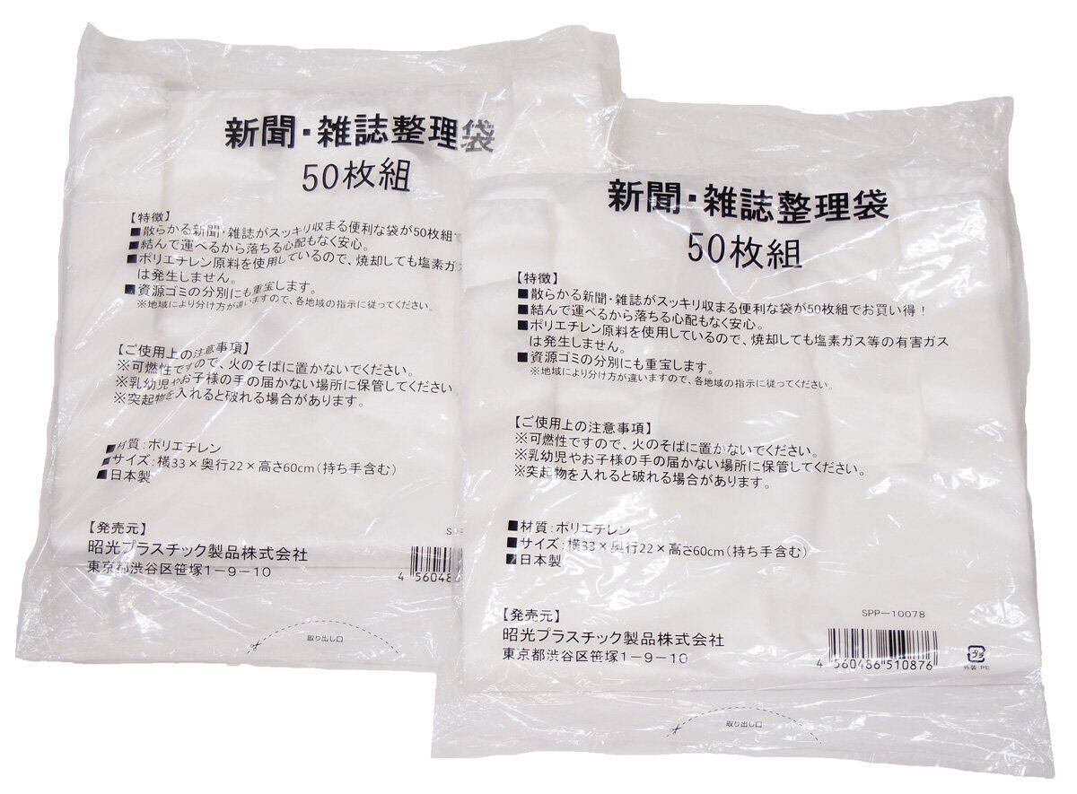 ●散らかる新聞・雑誌がスッキリ収まる便利な袋。100枚組でお買い得。 経済的 ●結んで運べるから落ちる心配もなく安心 ●資源ごみの分別にも重宝 ●ポリエチレン原料を使用しているから焼却しても塩素等有害ガスは発生しない