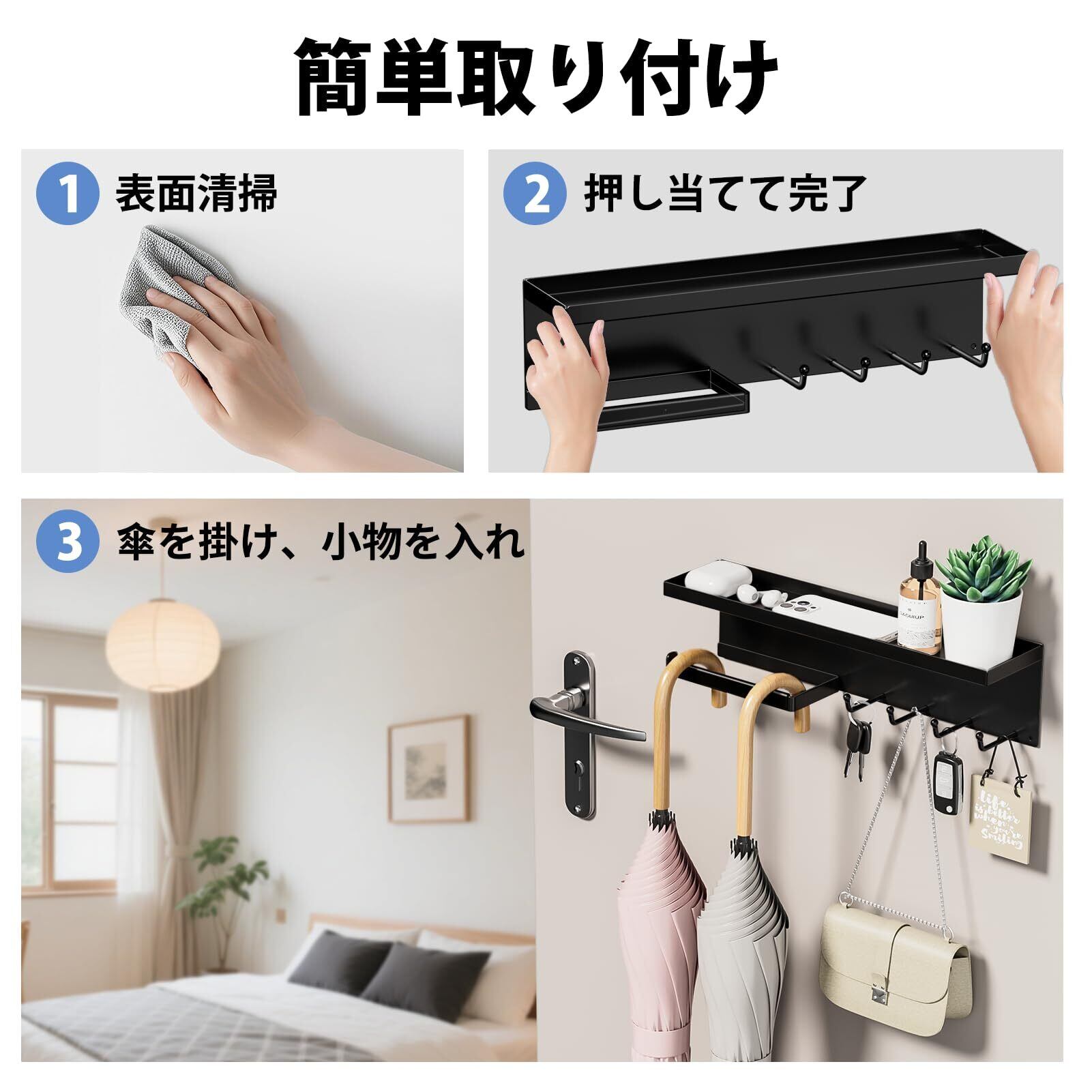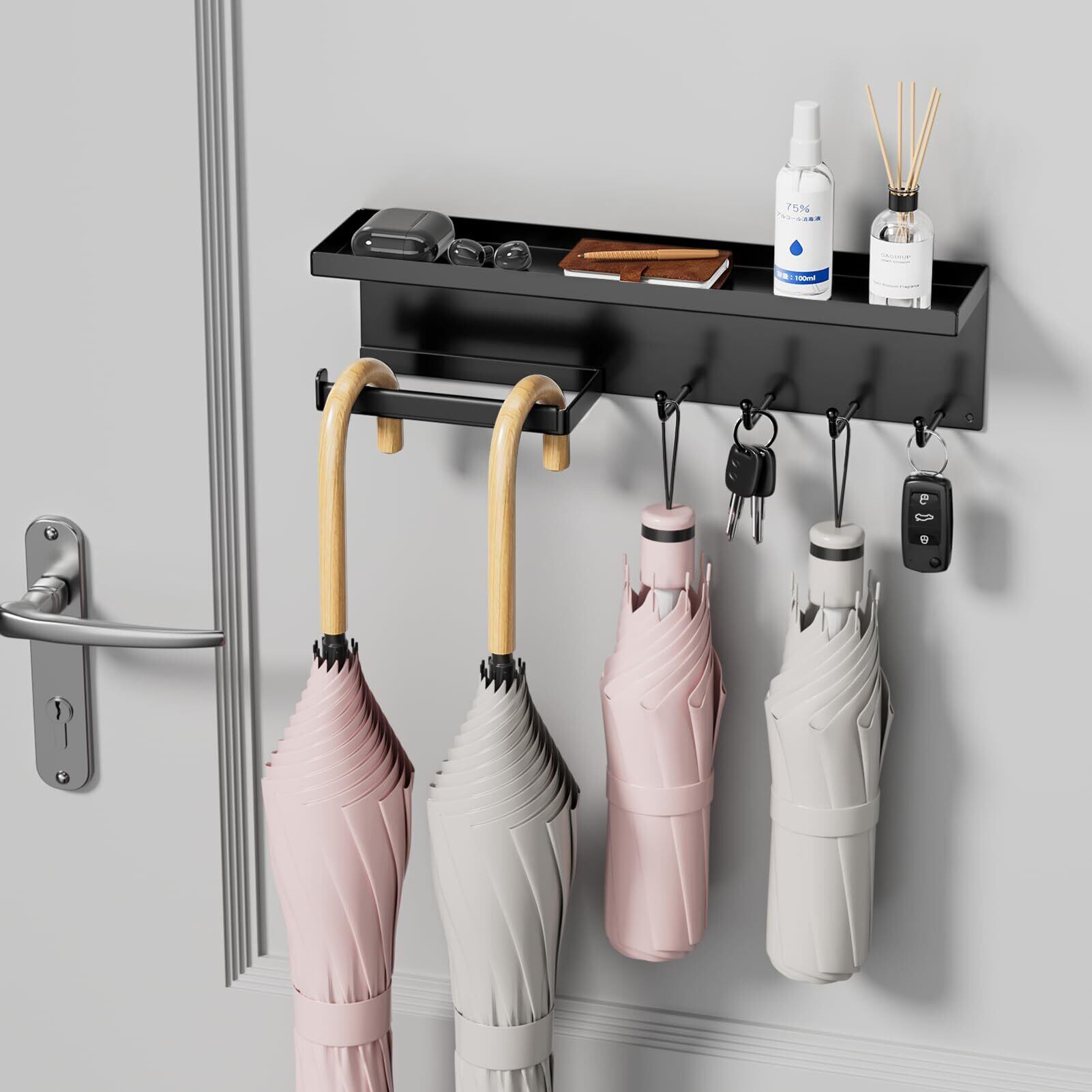 マグネット式玄関傘立て 穴あけ不要 滑り止め付き 折り畳み傘/長傘対応 小物収納 コンパクト 省スペース 簡単設置 ブラック