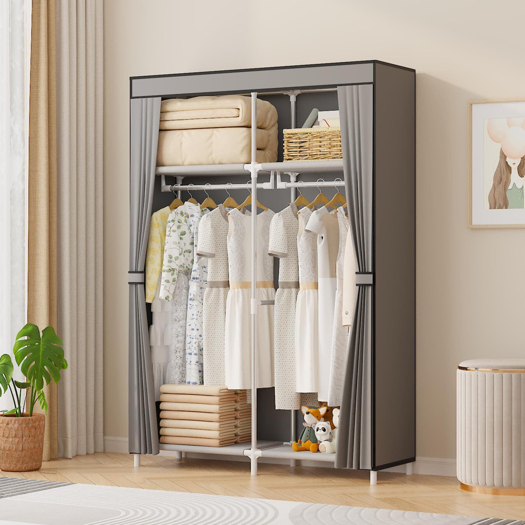 【特価セール】ワードローブ カバー付き 大容量 クローゼット 不織布 簡単組み立て式 ハンガーラック 省スペース 防水 防塵 防汚 耐用 幅105×奥行45×高さ170cm (グレー 105cm 幅)