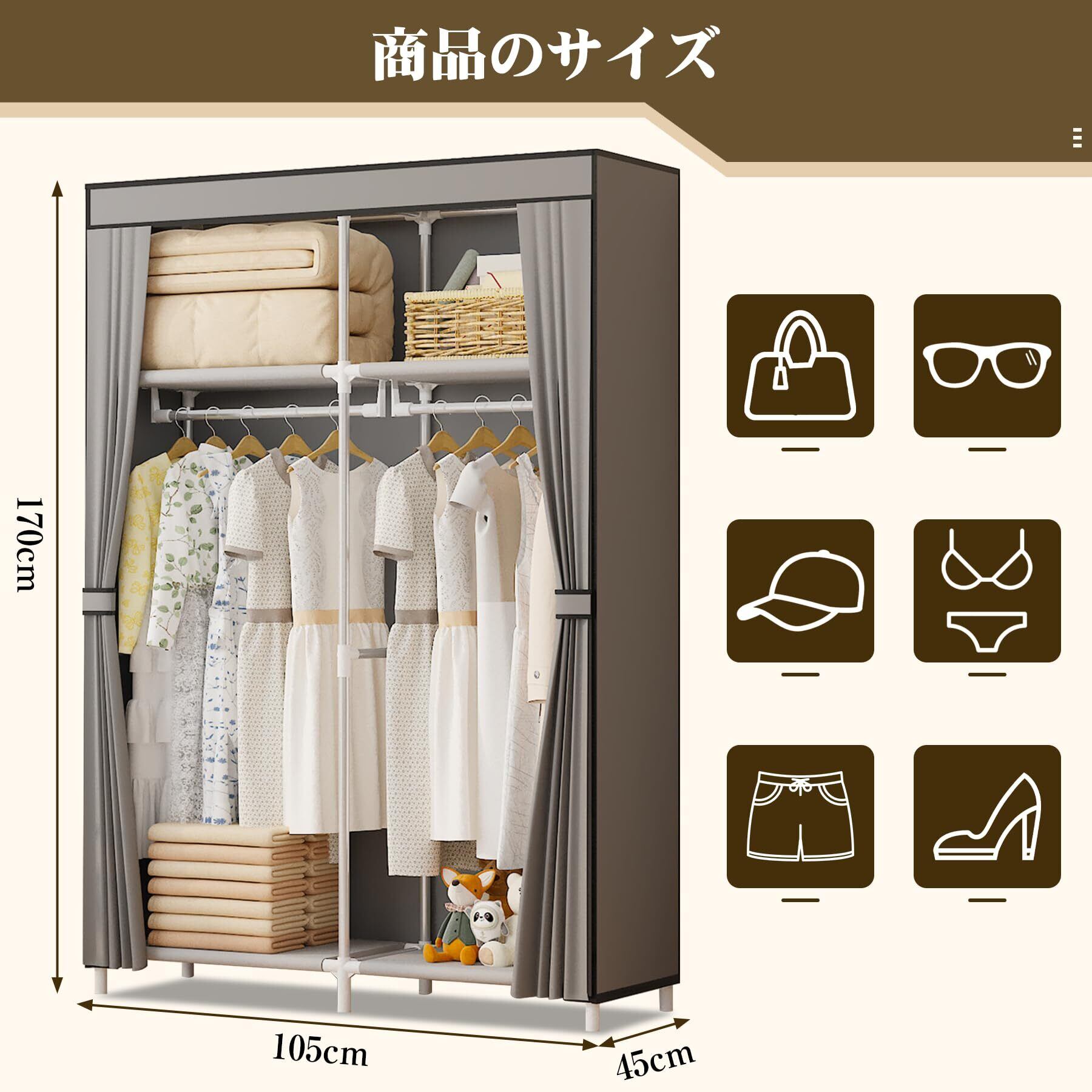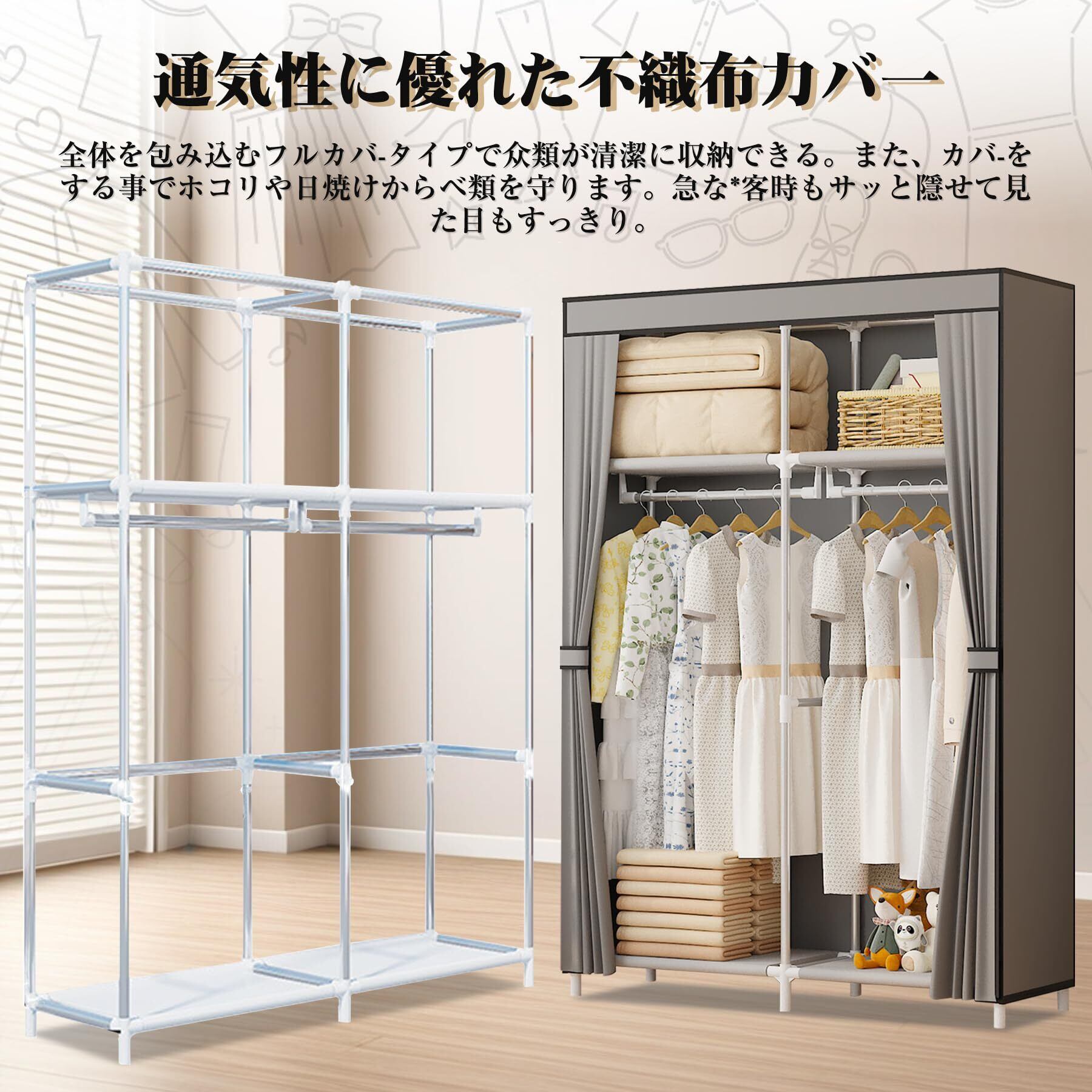 ワードローブ カバー付き 大容量 クローゼット 不織布 簡単組み立て式 ハンガーラック 省スペース 防水 防塵 防汚 耐用 幅105×奥行45×高さ170cm (グレー 105cm 幅)