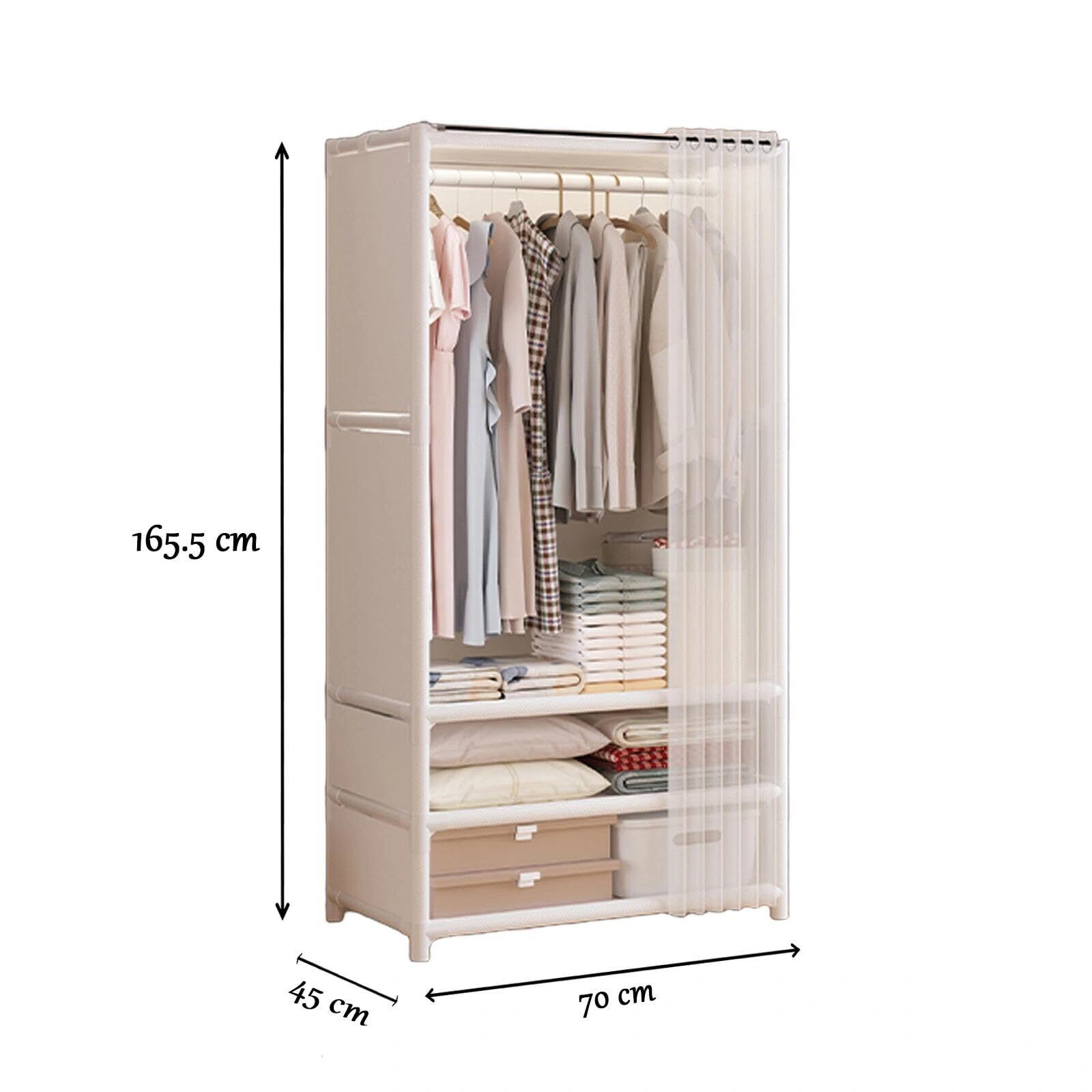 クローゼット 組立式 ワードローブ ハンガーラック カバー付き 家庭用衣類収納キャビネット 寝室・寮用 収納整理 サイズ 幅70cm x 奥行45cm x 高さ165.5cm 組み立て簡単 空間を有効活用 1列棚 ホワイト
