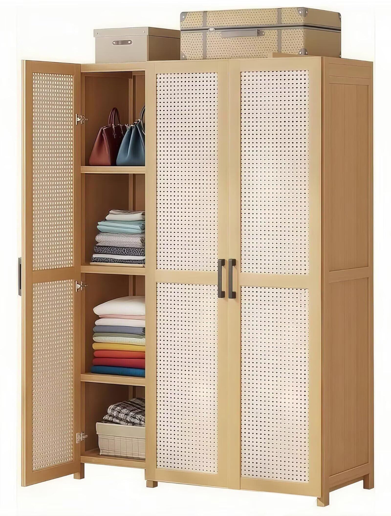 【数量限定】ワードローブ 扉付き クローゼット 幅90cm ハンガーラック 天然竹製 通気性 大容量 洋服タンス 棚付き 奥行き42*高さ161.1cm 省スペース 組み立て式 衣類収納ラック 寝室 寮 仮設住宅適用 日本語説明書付き (3扉-幅90cm)