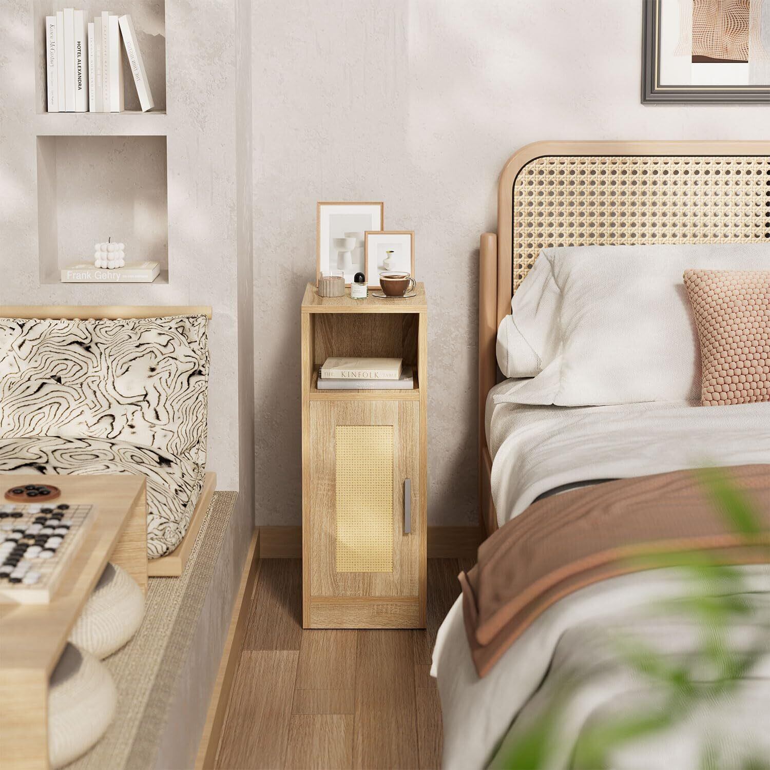 【数量限定】IBUYKE ベッドサイドテーブル ナイトテーブル ベッド横 テーブル 籐編み MDFボード 収納 扉付き すき間収納 スリム 木製 組立簡単 一人暮らし 和風 省スペース リビングルーム ベッドルーム用 ナチュラル JPWNS012N