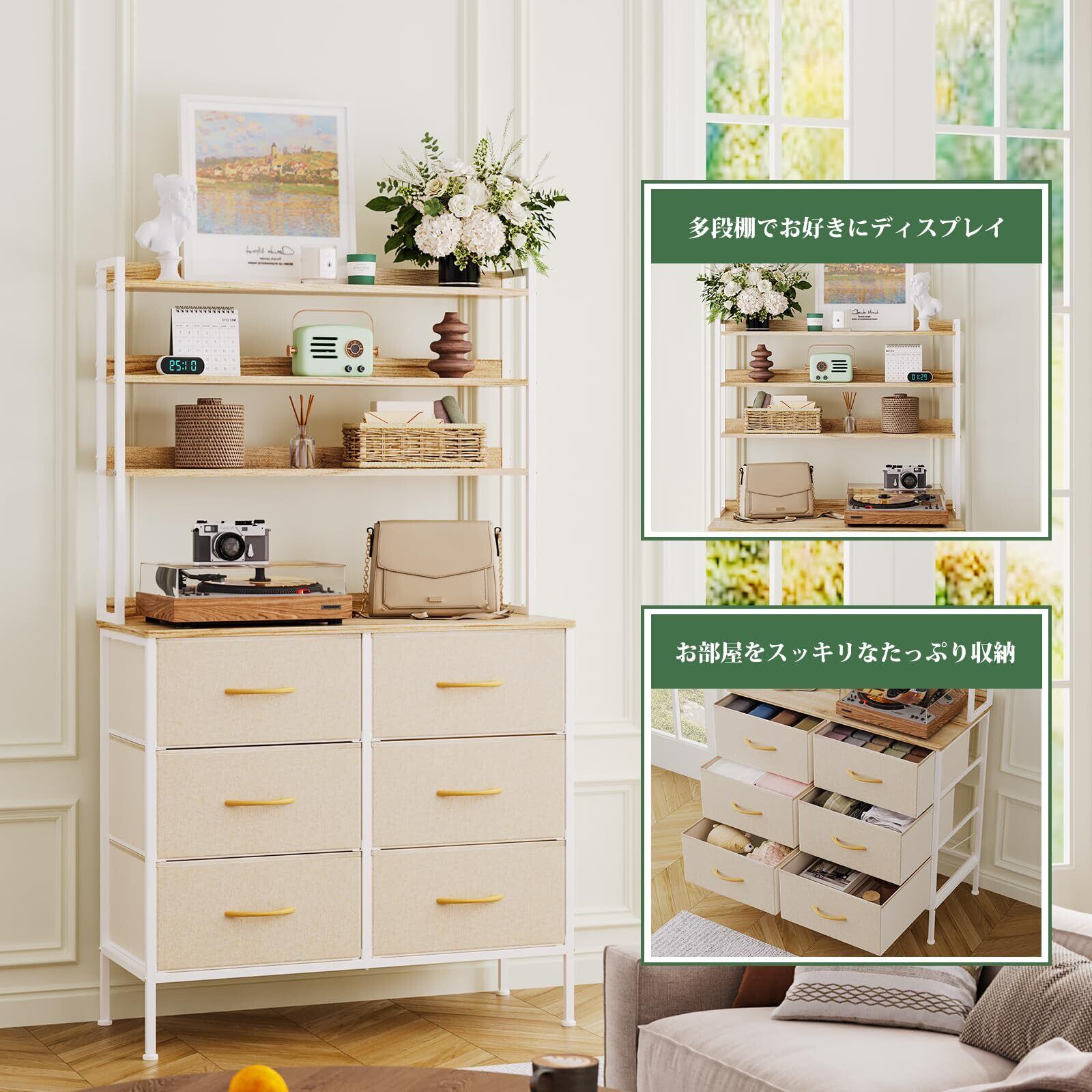 3段木製ディスプレイラック付きハイチェスト タンス 布製引き出し6杯 ロボット掃除機OK 衣類収納 オープンシェルフ 多目的収納棚 本棚 整理棚 シンプル 幅80cm(高通気性カチオン生地 ベージュ)