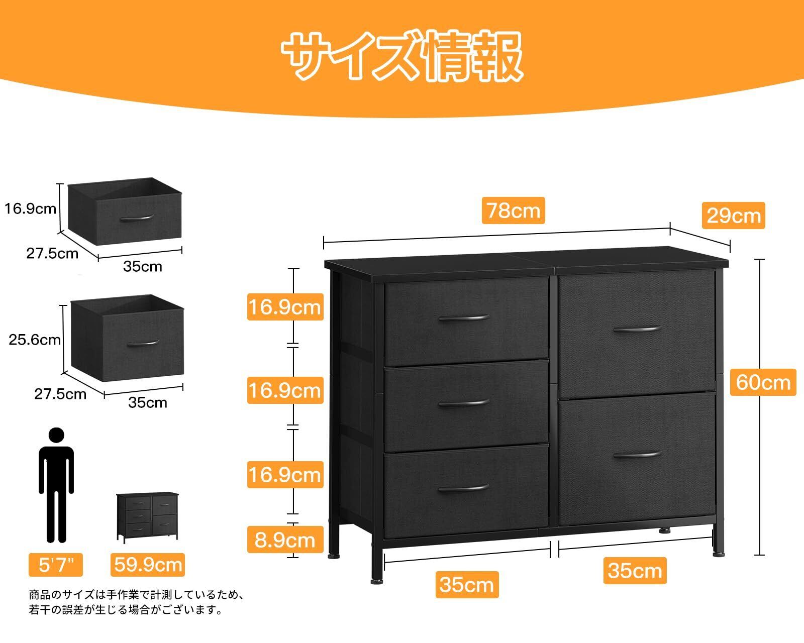 【2022最新】AODK チェスト タンス 収納チェスト 引き出し 3段棚 キャビネット リビング収納 収納ケース 衣装ケース 木製 おしゃれ 大容量 収納棚 脱衣所 衣類収納 転倒防止 安定感 3段5杯(L78×W29×H60cm,ブラック)