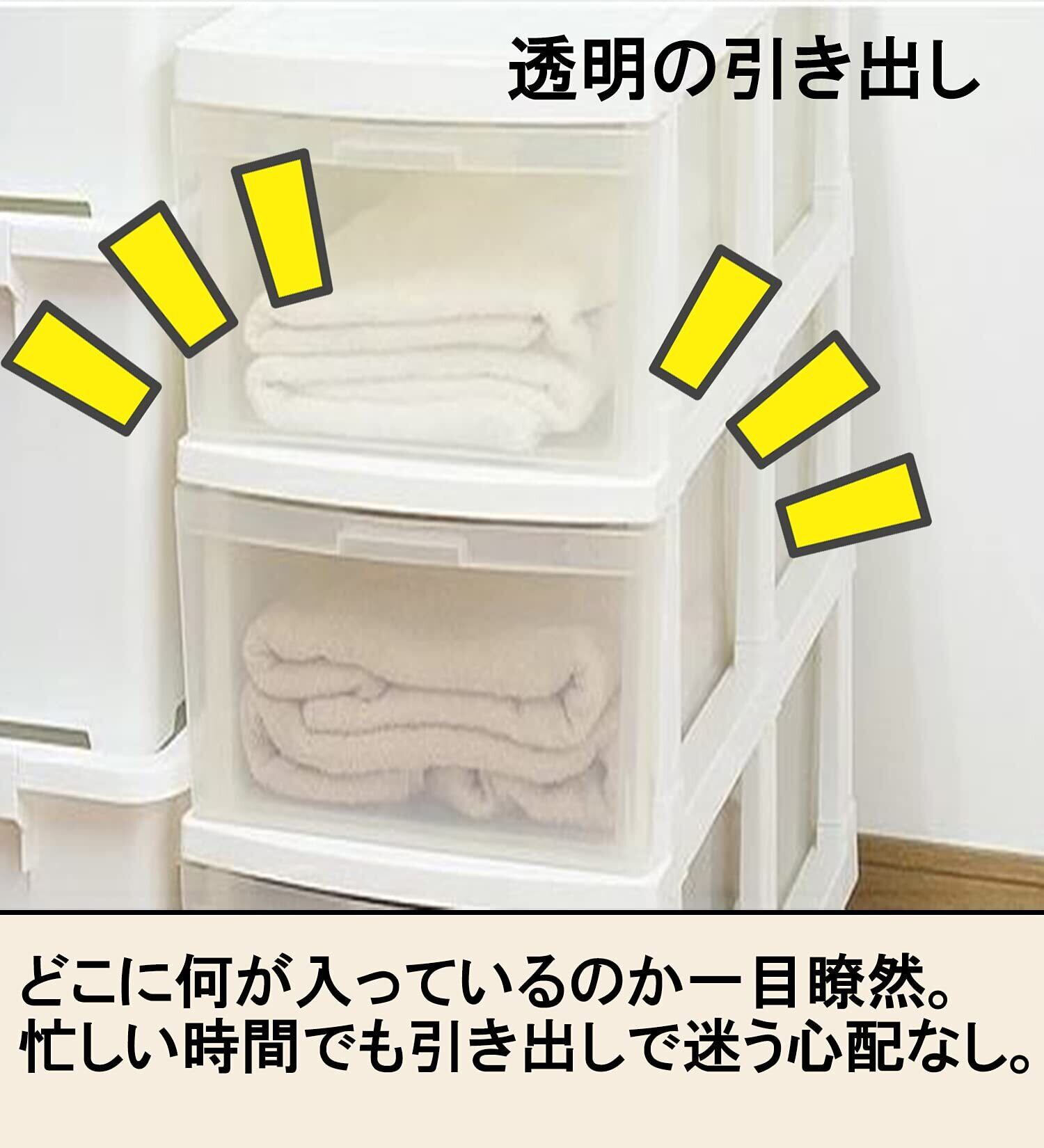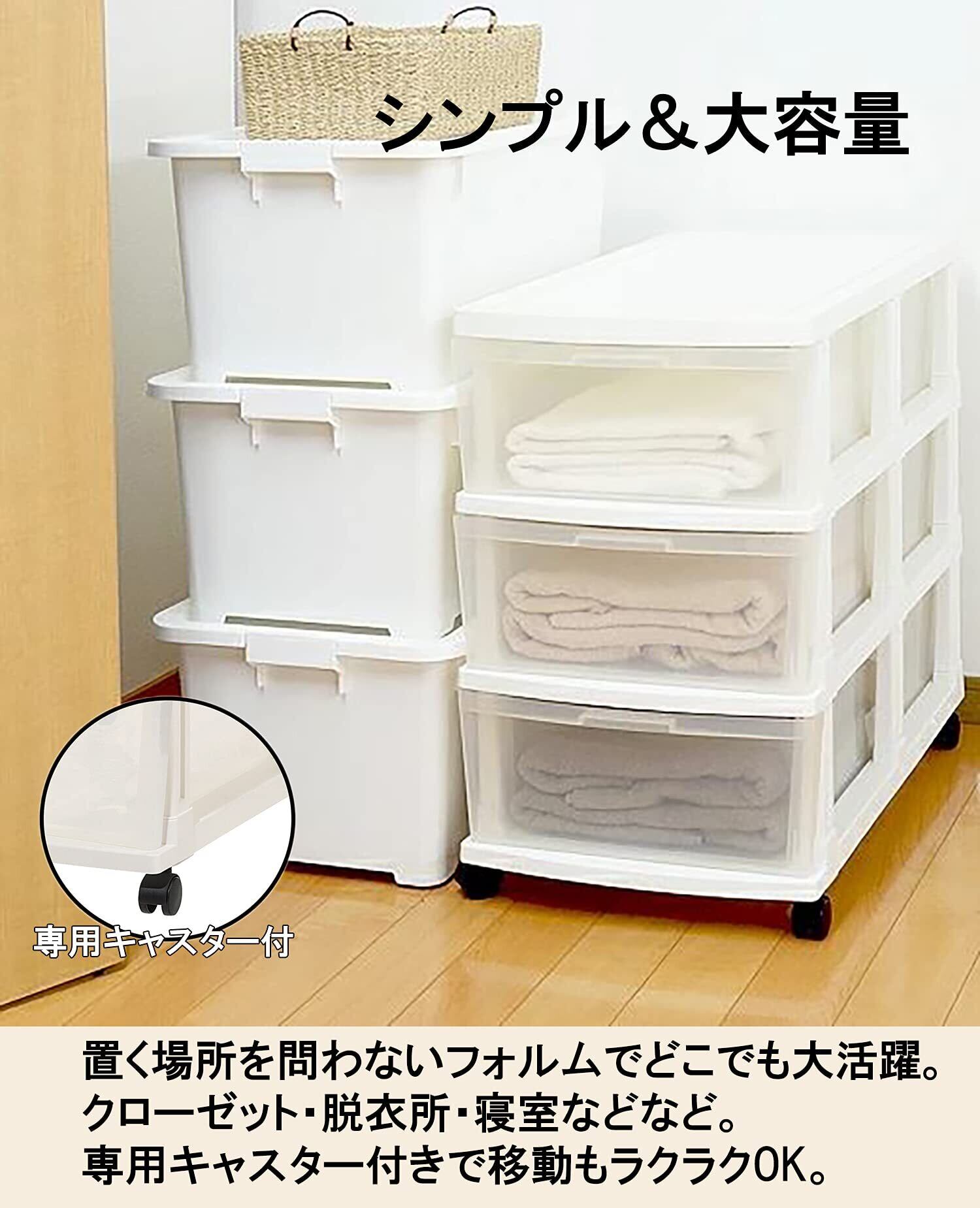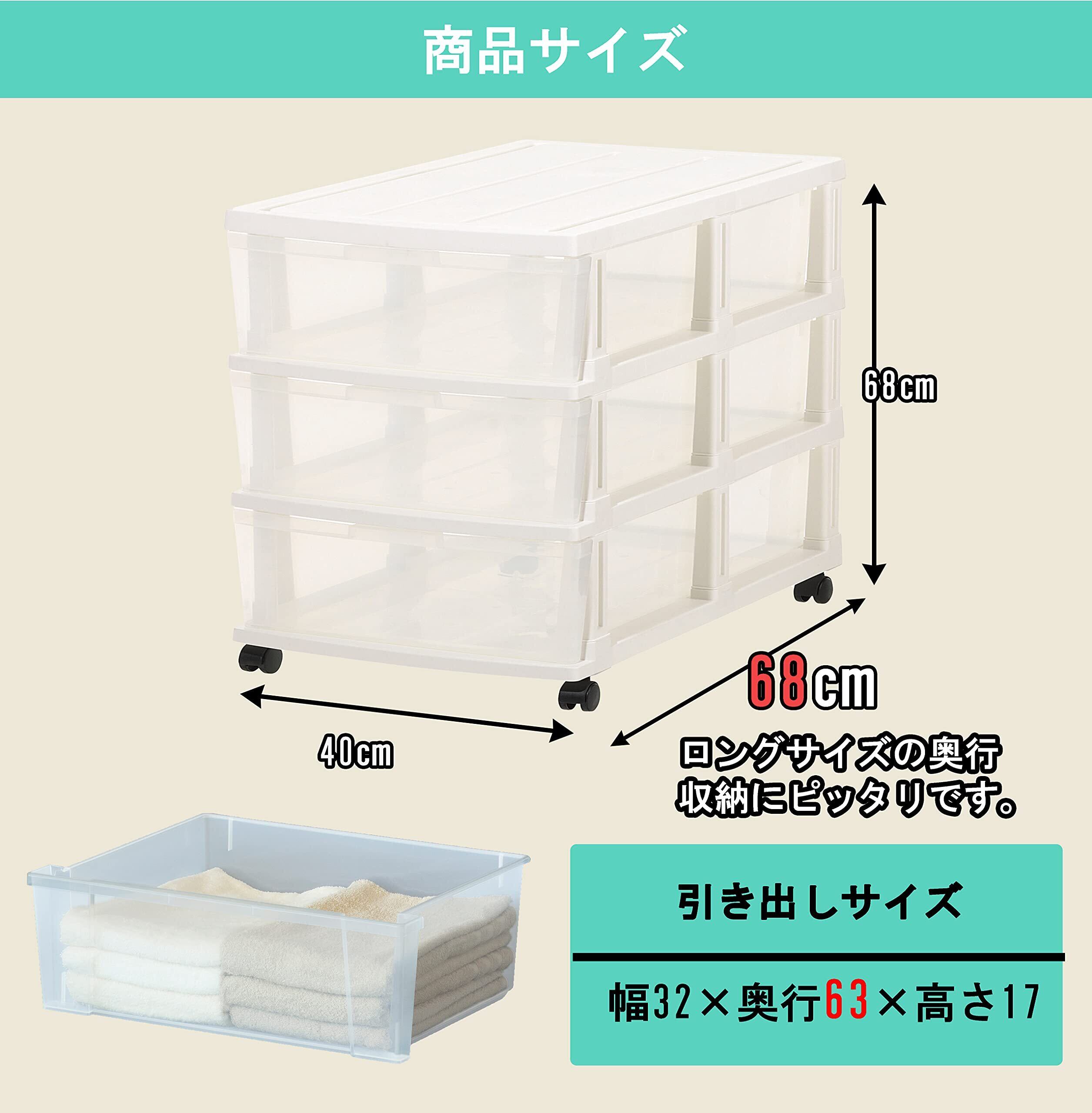 クリアな引出しだから中身が見えて、忙しい時間にも使いたいものがスっと取り出せます。3杯の引出し式ストッカー、押入れの中やお部屋の片すみで衣類整理に便利なアイテム。キャスター付で移動も簡単、お掃除の時などにサッと動かせます。付属キャスターを使用しない場合:H630mm引出し内寸:(約)W258×D371×H168mm。