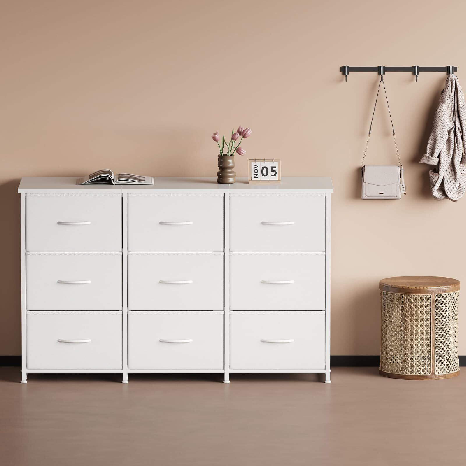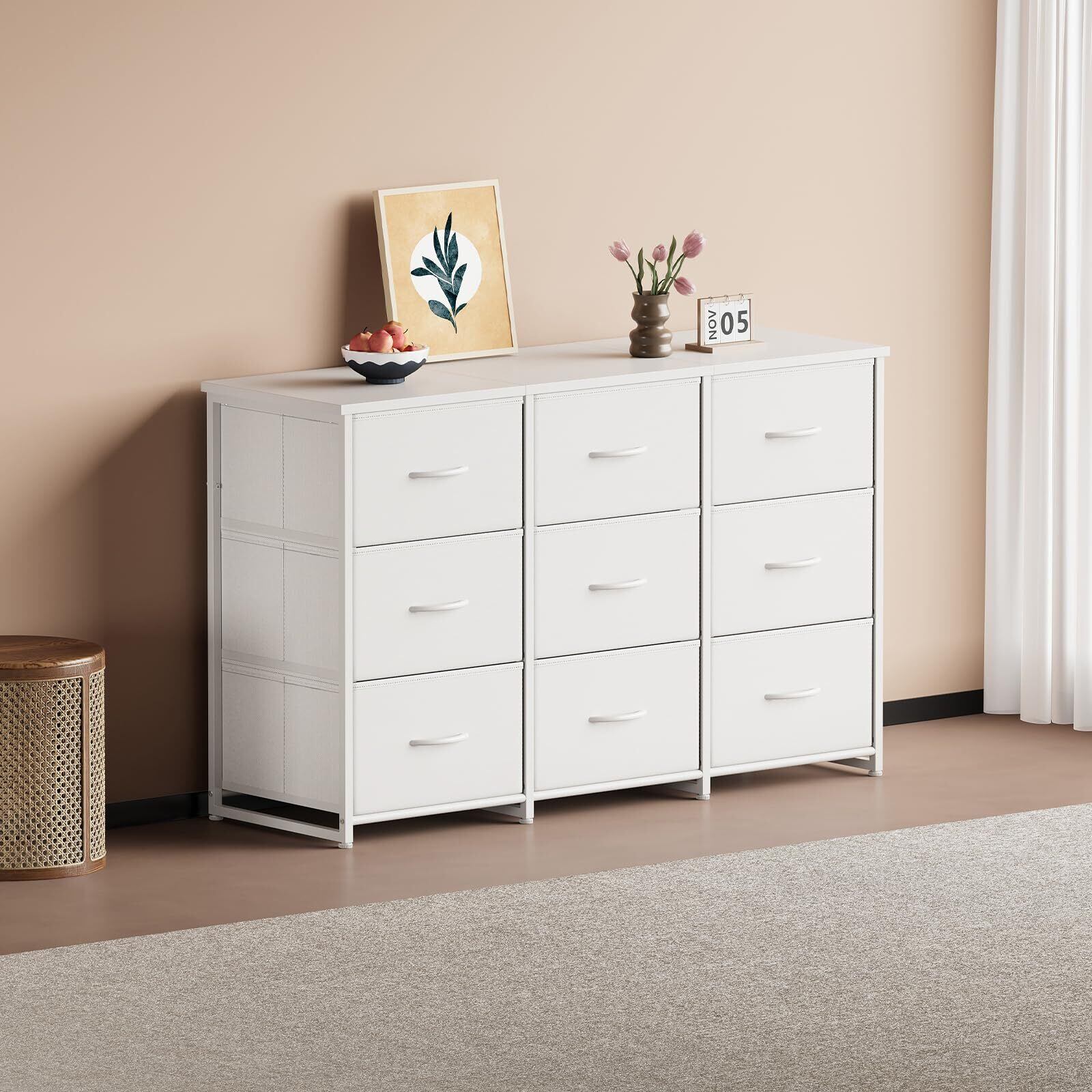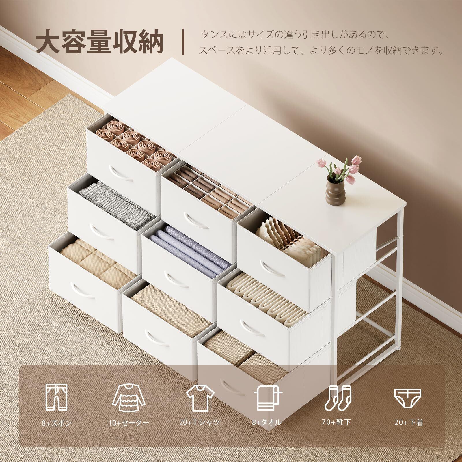 チェスト タンス 洋服収納 幅120cm 布製引き出し大容量収納 3段9杯 組立簡単 衣類収納 タンス おもちゃ収納 箪笥 本棚 衣装ケース 脱衣所 寝室 リビング 収納 省スペース 収納家具 白い