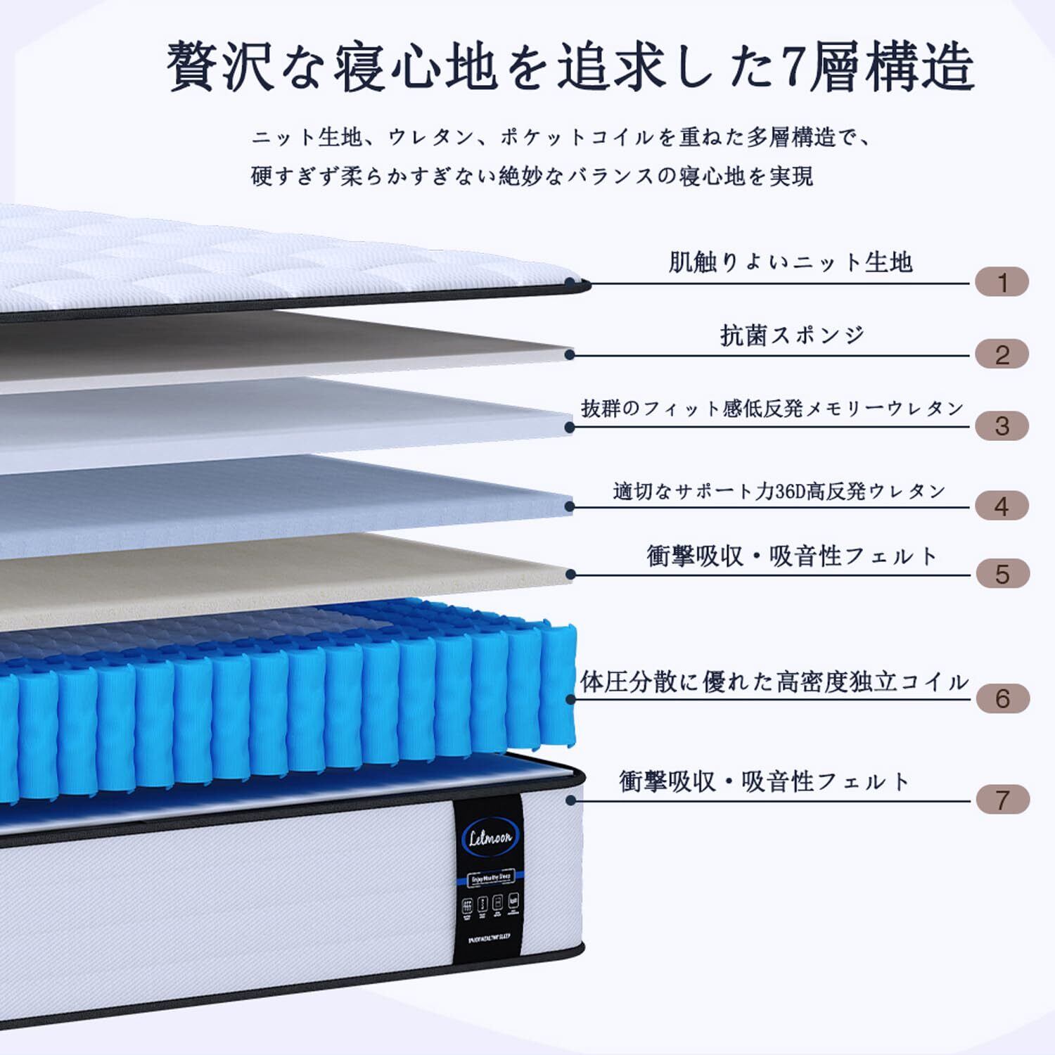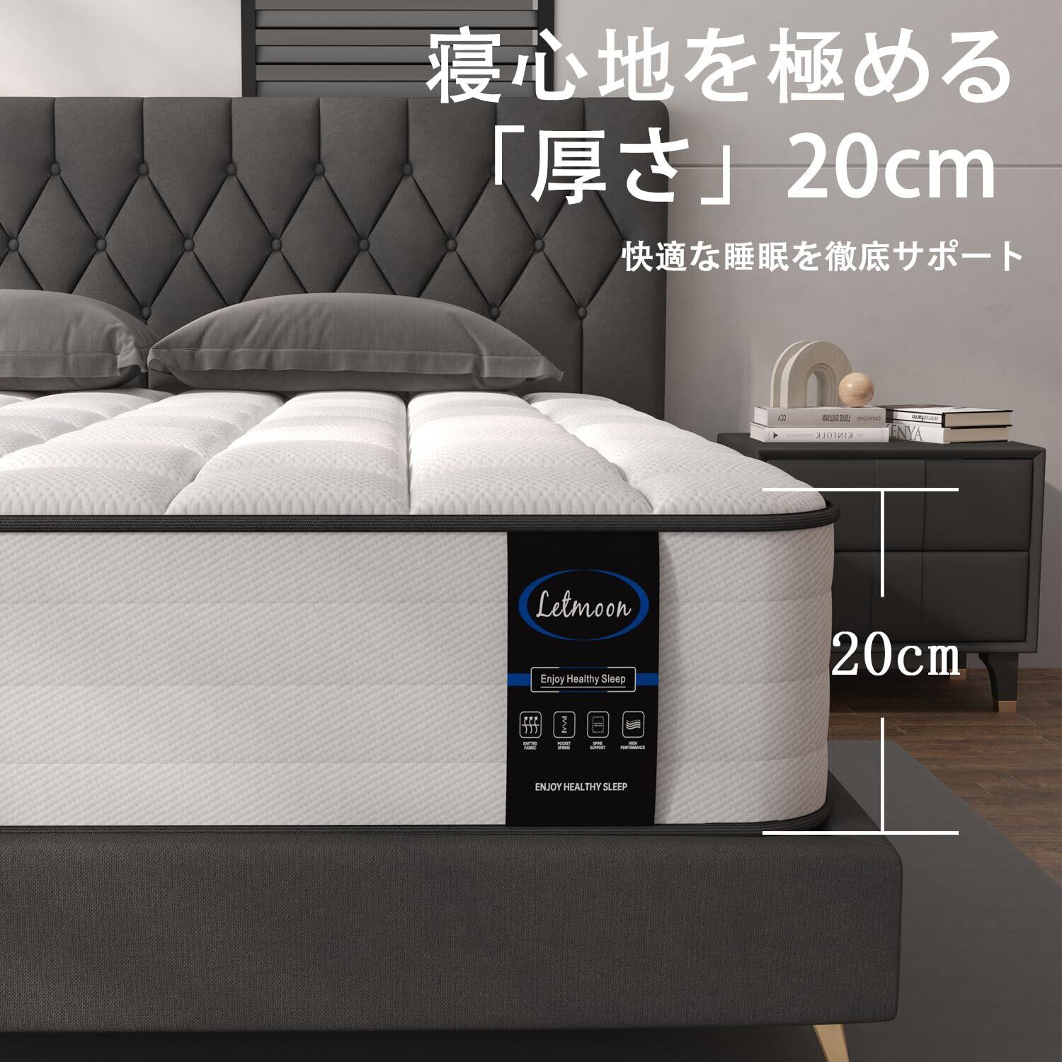 【適度な硬さ&ポケットコイル】厳選された「2.0mmと2.2mm」の高品質スプリングを使用し、高密度独立ポケットコイルは並行配列の構造により、各スプリングがより自由に伸縮し、弾力がありながら適度な硬めの寝心地を実現します。さらに、コイルとコイルの間のスキマが多くため、通気性が向上します