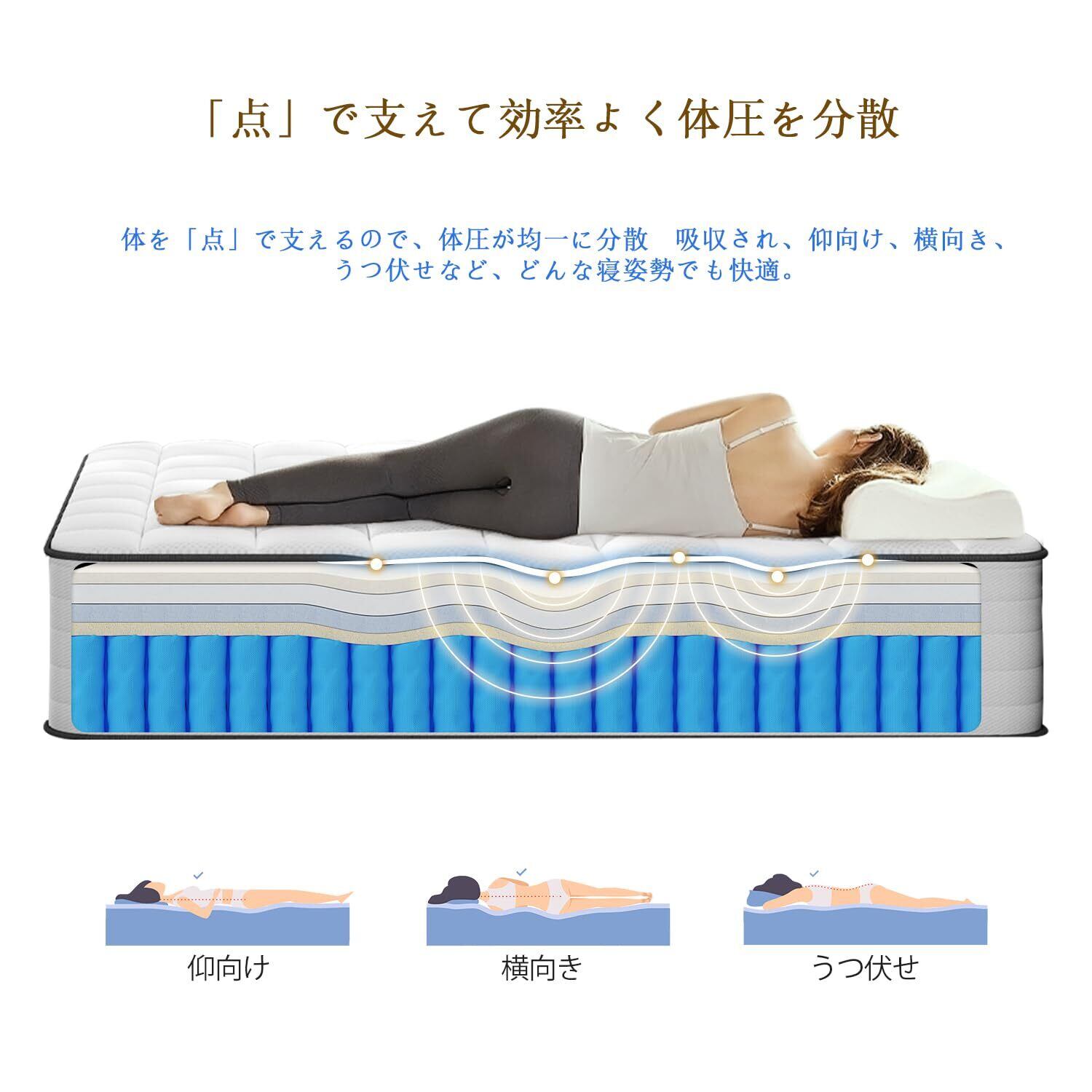 【体圧を分散し、負担を軽減】高反発マットレスは、身体を「点」で支える高密度ポケットコイルと、高反発と低反発の2層のウレタンフォームを採用します。頭・肩・腰・お尻・足にぴったりフィットし、身体にかかる負担を分散し、寝返りのしやすい睡眠環境をつくります。仰向け、横向き、うつ伏せなど、どんな寝姿勢でも快適な寝心地を保ちます