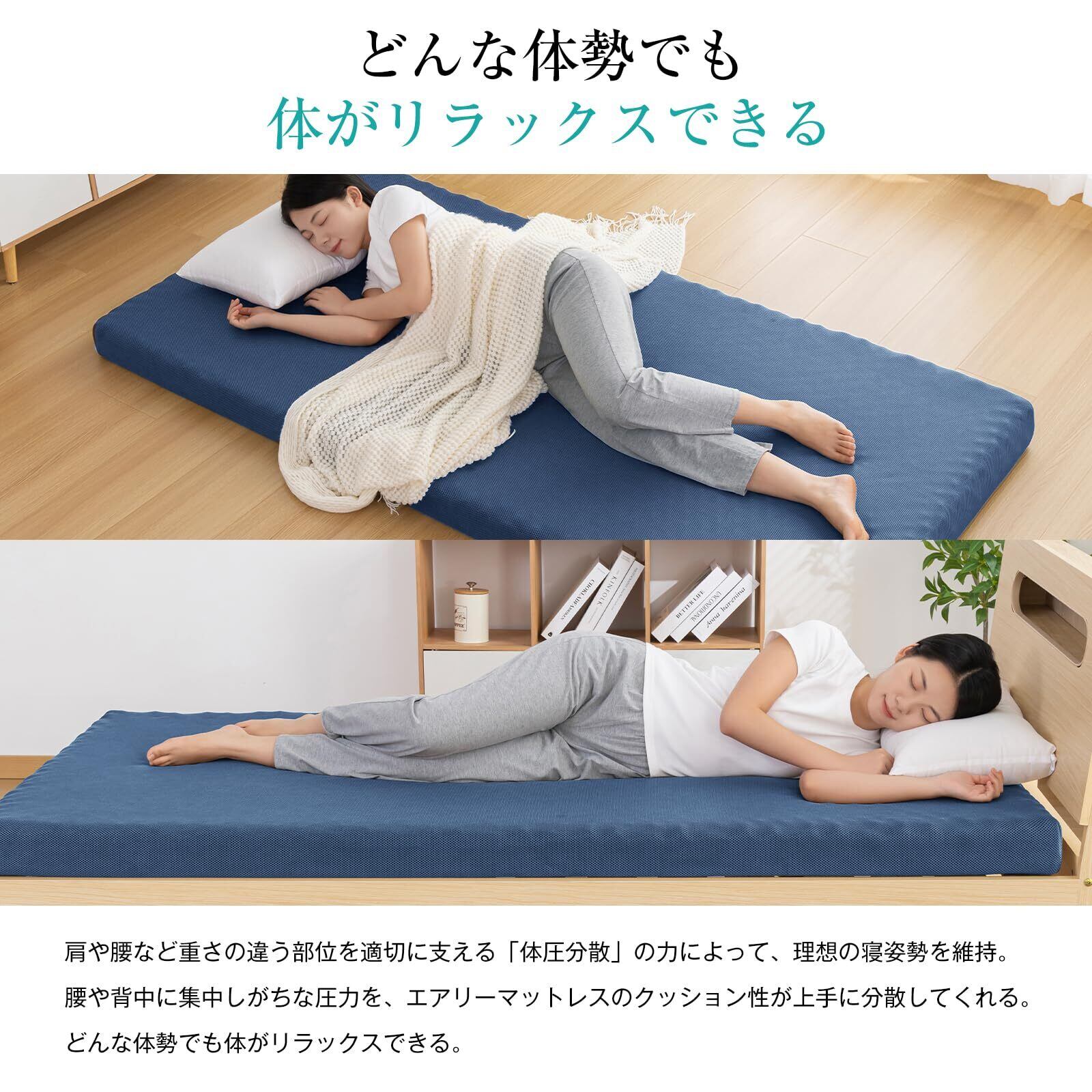 【10cmの高反発ウレタンで底付き感を出さない】当店の高反発マットレスは、厚さ10cmの高密度ウレタンを使用しています。床に直接敷いても底付き感がなく、しっかりとしたクッション性を持つ10cmの厚みに設計。厚みのあるウレタンが体をしっかり支え、寝返り時の反発力も抜群。深く快適な睡眠をお届けします。