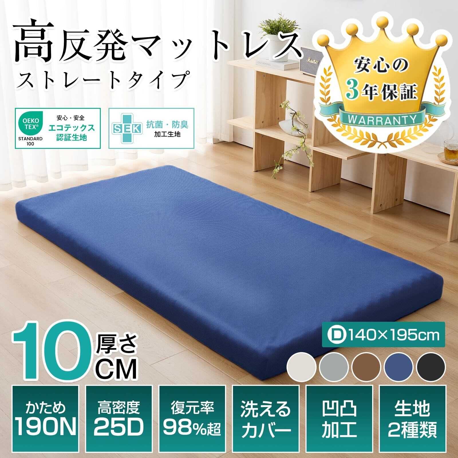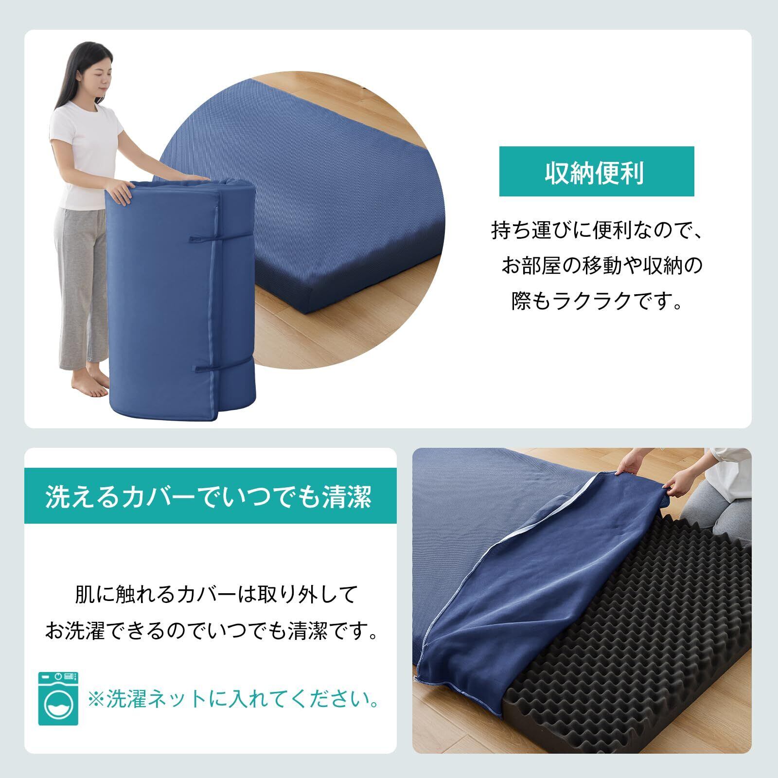 【数量限定】Housecover マットレス ダブル 高反発 硬め190N 極厚10㎝ ベットマット 凹凸加工 敷布団 高密度 お昼寝マット 体圧分散 抗菌防臭 通気性が良い 折り畳みマットレス コンパクに収納 洗えるカバー取り外しでき 圧縮梱包 140 x 195 x 10cm ネイビー01