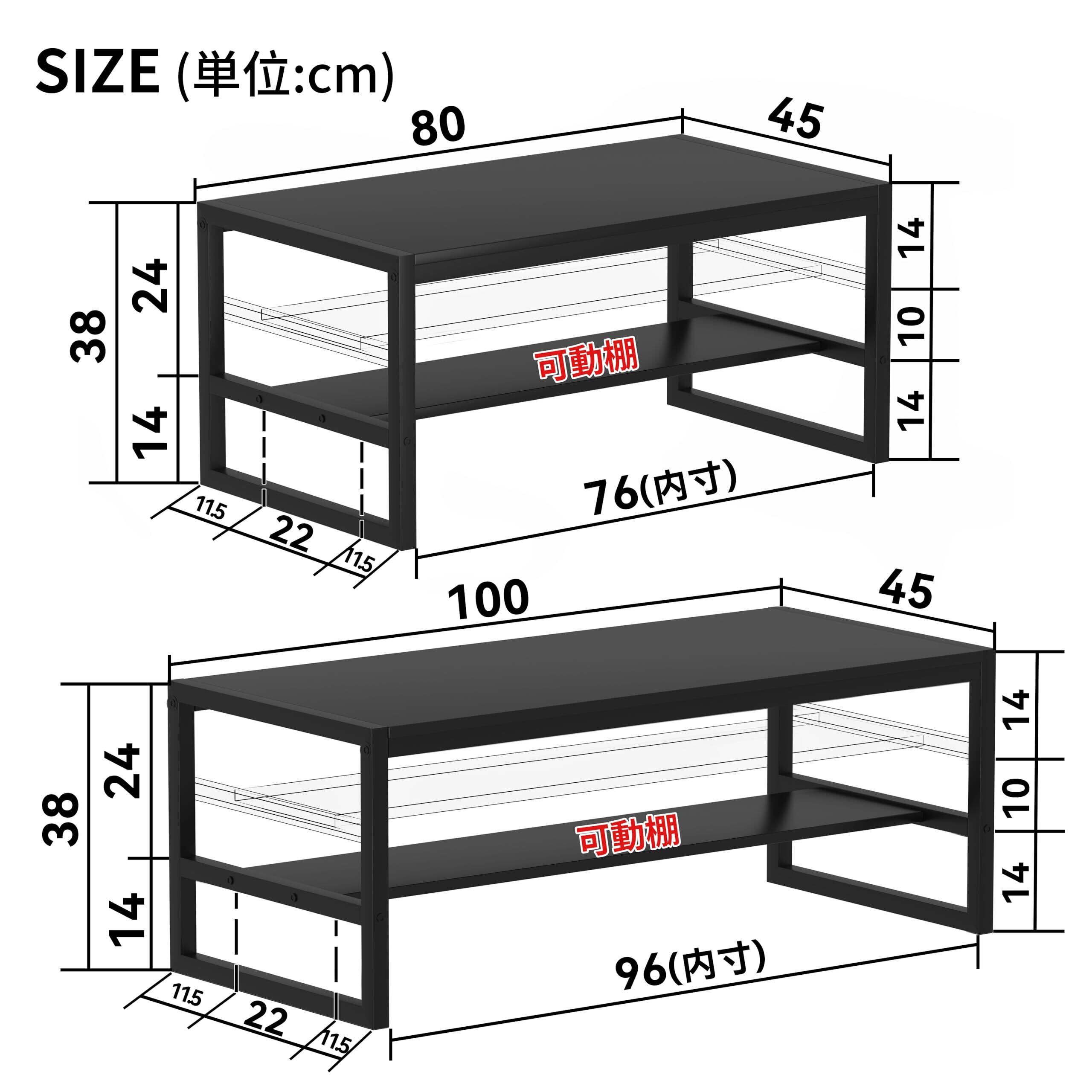 LunarLight ローテーブル 幅80奥行45高さ38cm センターテーブル リビングテーブル コーヒーテーブル 机 座卓 コンパクトデザイン 収納棚板の高さ可動式 床傷防止用のアジャストフェルト付き 強度安定 錆び防止 耐摩耗性 防水性 耐熱性機能 (ブラック, 幅80cm)
