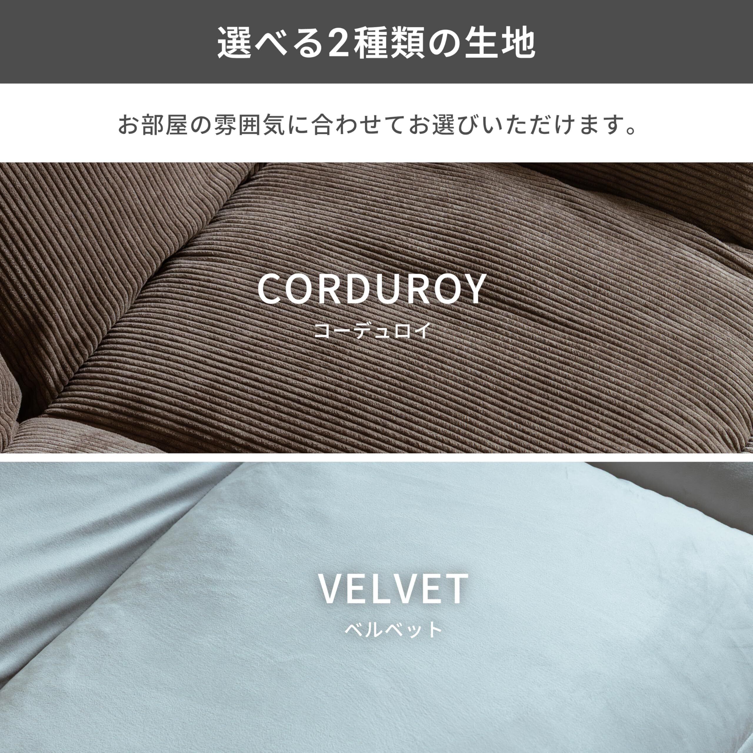 【選べる生地・サイズ】おしゃれな「コーデュロイ生地」と触り心地のいい「ベルベット生地」の2種類から選べます。カラーも全6種類と豊富です。サイズは「2人掛け」と「3人掛け」をご用意しております。