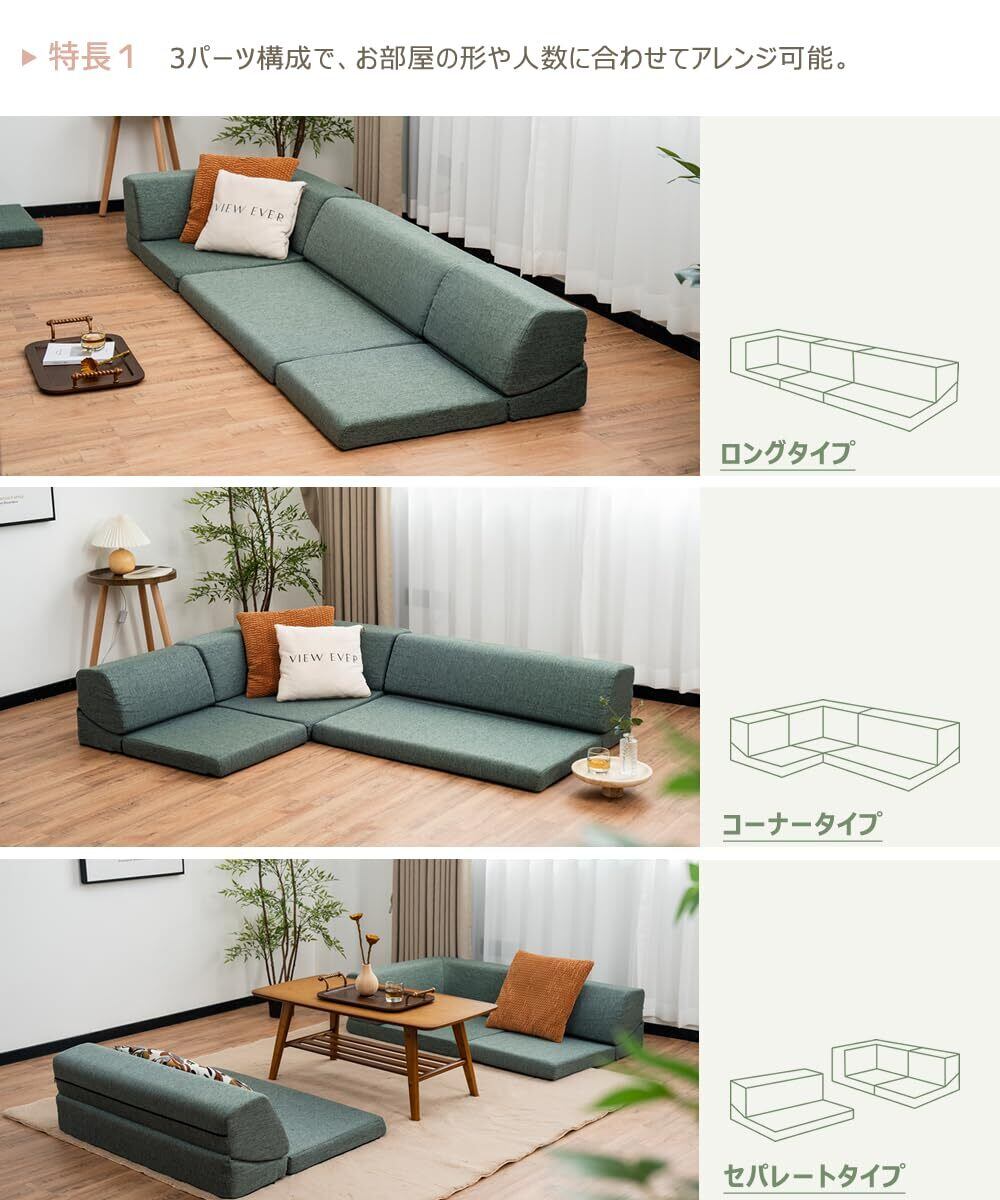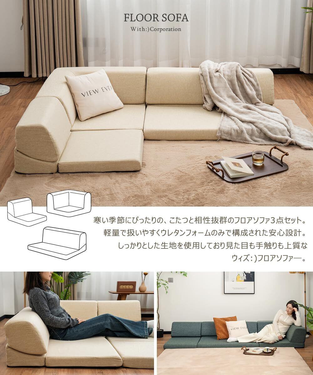 2P・コーナー・1Pの3分割構成で自由にレイアウト可能。こたつとの相性もよく、寒い季節も快適に過ごせます。滑り止め加工付きでズレにくく安心。素材:ウレタンフォーム・ポリエステル100%、生産国:中国。
