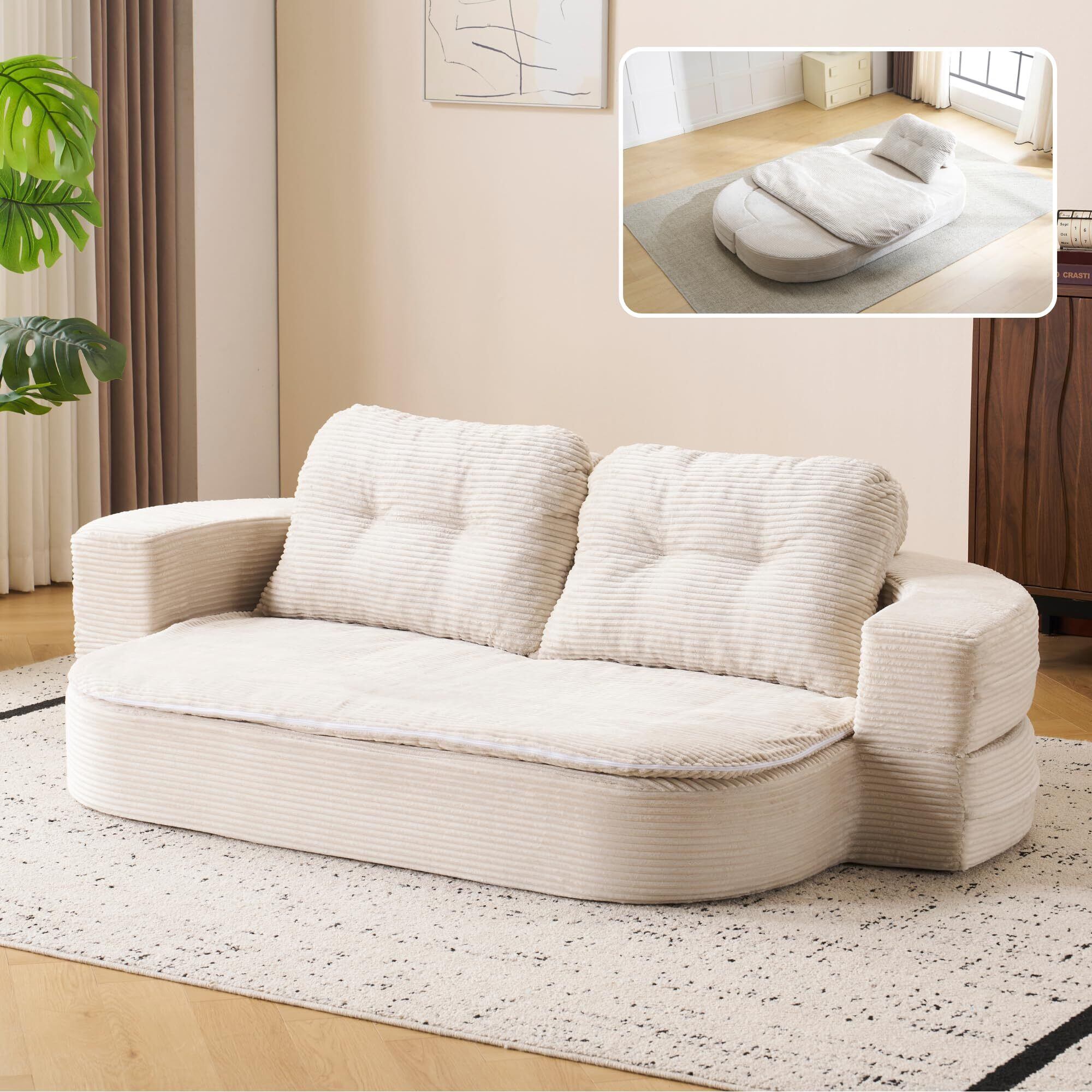 【シーンに合わせて自在に変形】 1台で複数の使い方が可能な多機能ソファ。 ソファスタイル:広めのアームレストに身体を預けて、リラックスタイムを快適に。 ベッドスタイル:クッションを対角に配置すれば、複数人でも広々と遊べるスペースに早変わり。お子様同士のプレイマットとしても最適。 【満足感たっぷりのワイドな座面】 奥行約65cmの広々とした座面は、あらゆる姿勢で快適。あぐらをかいたり、横になったり、自由な体勢でリラックスできます。