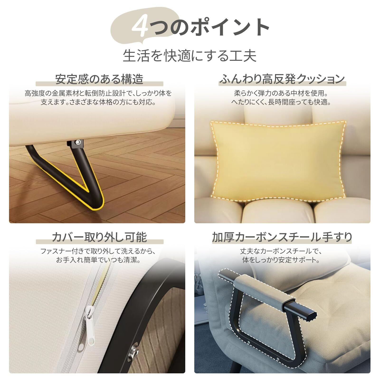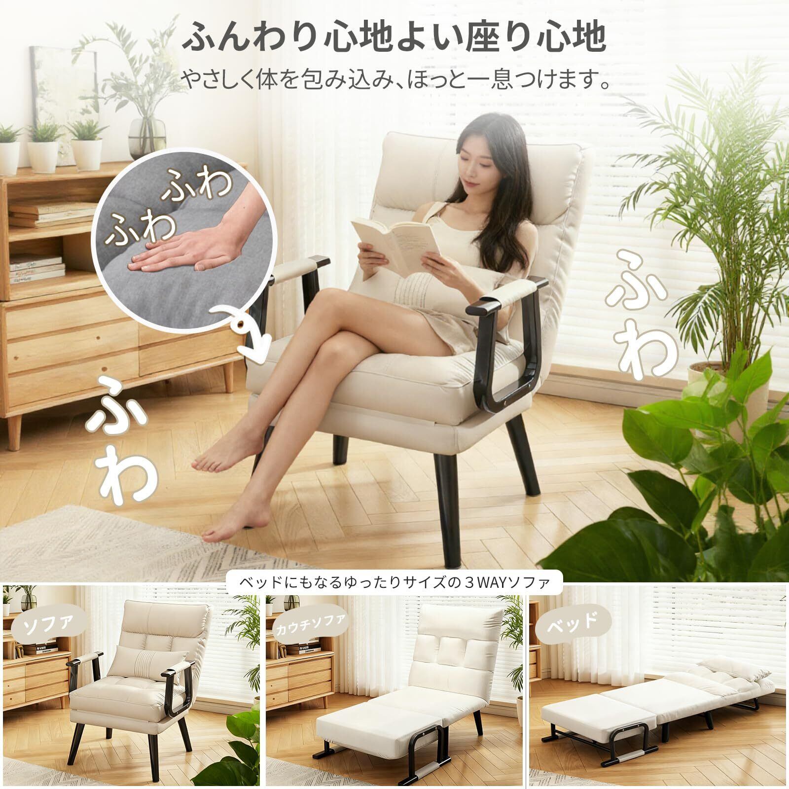 【日本製リクライニングギヤ搭載&5段階リクライニング】サイズ:ソファ時:幅65×奥行65×高さ97cm(座面高約45cm) ベッド時:幅65×奥行170×高さ27.5cm 背もたれは90°~180°で5段階調整可能。読書、映画鑑賞、ゲーム、横になって休むなど、さまざまなシーンに合わせて快適に調整できます。座面・背もたれには適度な硬さのウレタンフォームを使用し、長時間でも疲れにくく快適です。