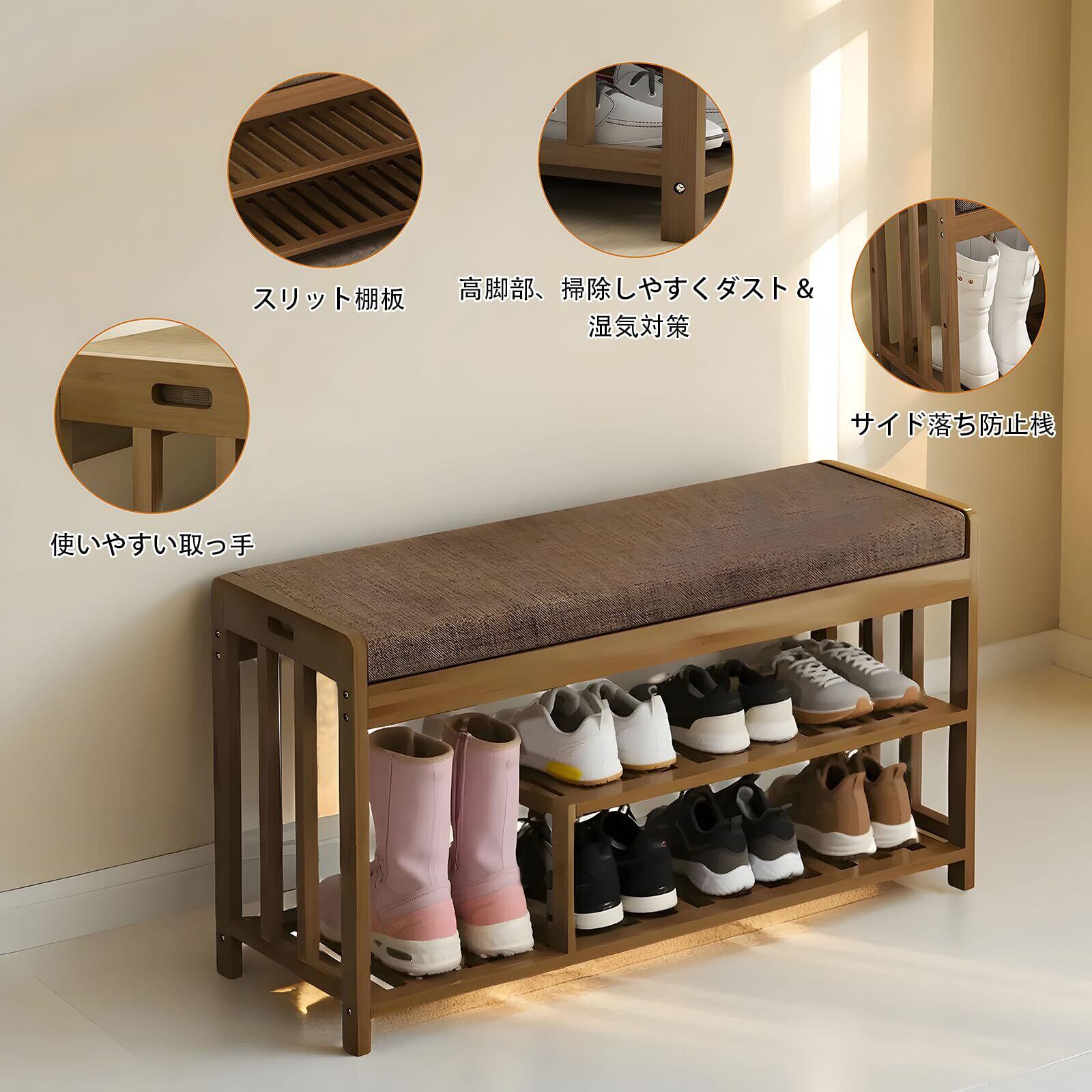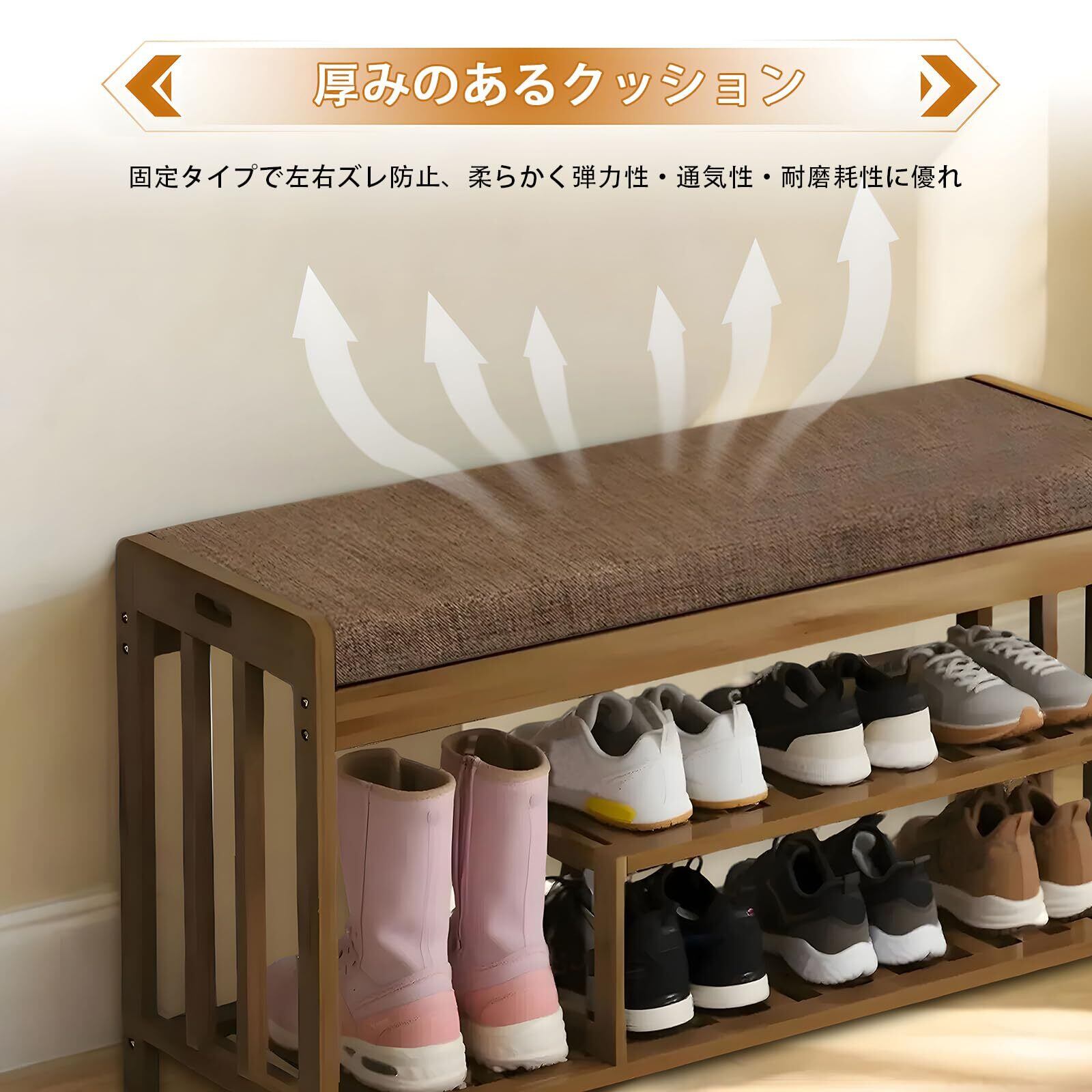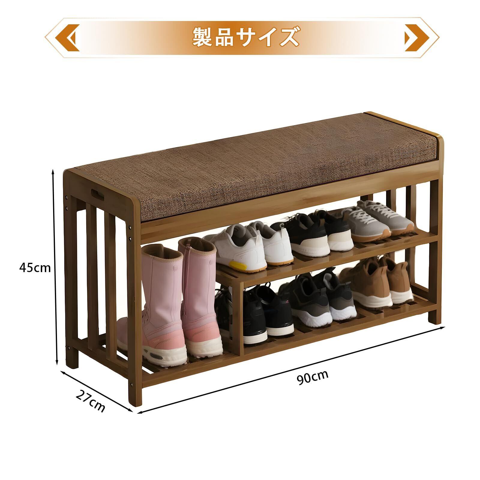 シューズラック 竹製 玄関ベンチ 収納ベンチ 玄関椅子 玄関スツール 幅90×奥行き27×高さ45cm 二段式靴収納 座面クッション付き 玄関収納 おしゃれ 耐荷重150kg 下駄箱 フットスツール 内凹み型持ち手 通気性 防塵 省スペース 組立簡単( ブラウン)