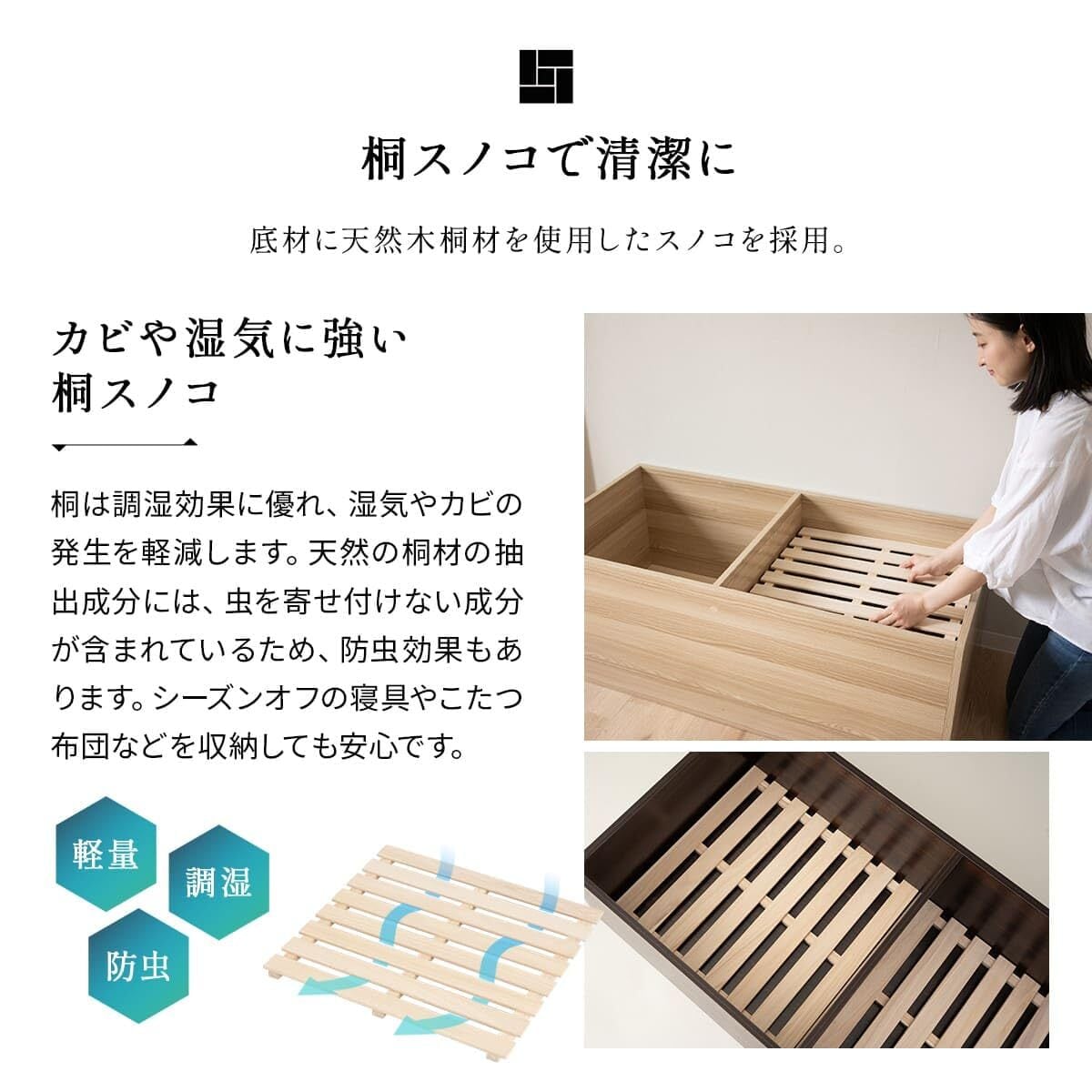 調湿効果に優れ、湿気やカビの発生を軽減する天然の桐材を採用。虫を寄せ付けない成分が含まれており、シーズンオフの寝具やこたつ布団などを安心して収納できます。