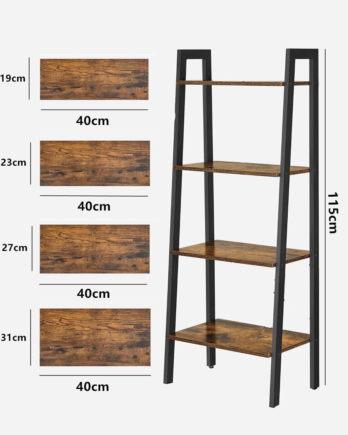 【コーナーシェルフのサイズ仕様】:収納ラックのサイズはH115CM×W40CMです。はしご型の4段収納ラックなので、各段の奥行は上から下まで異なります19CM→23CM→27CM→31CM)。