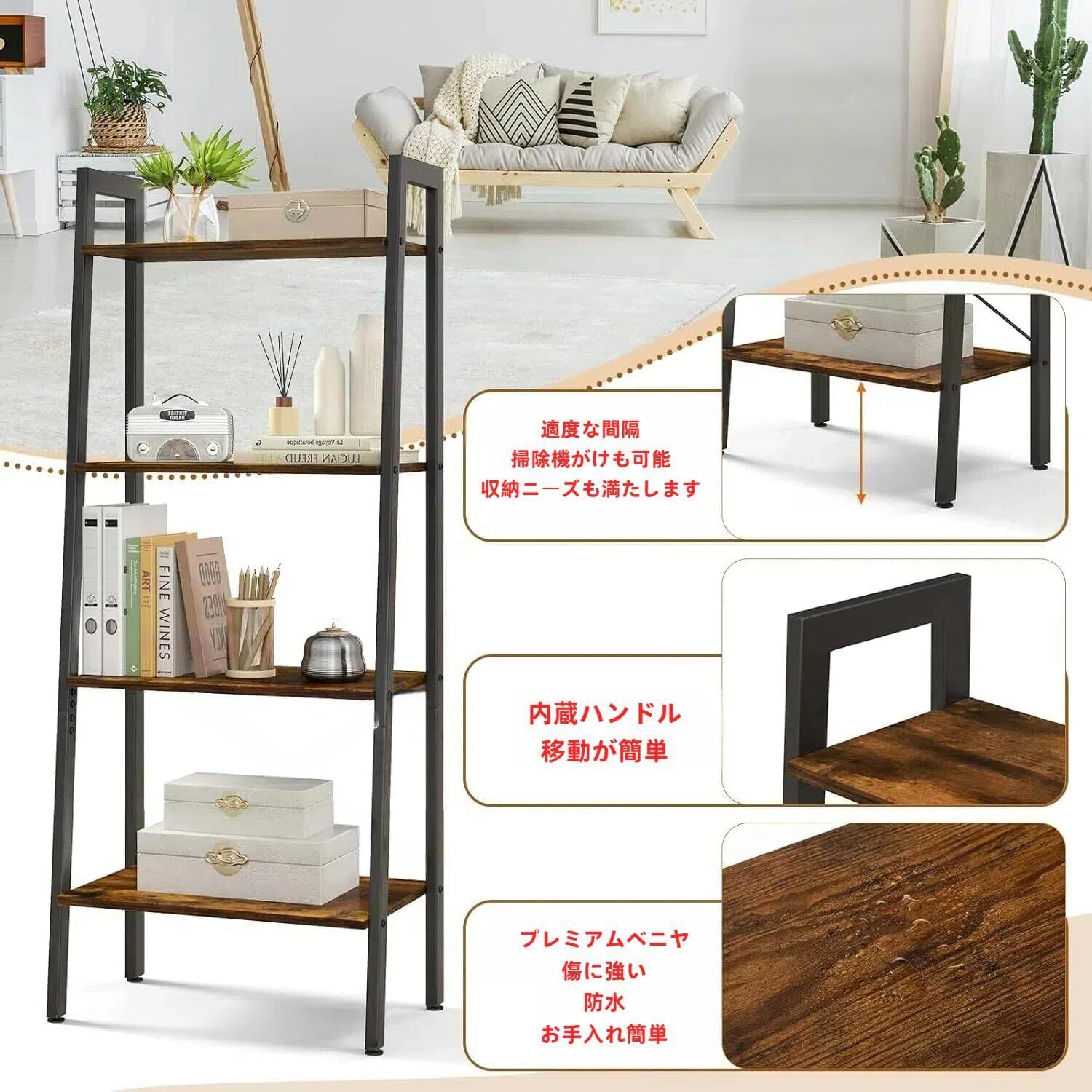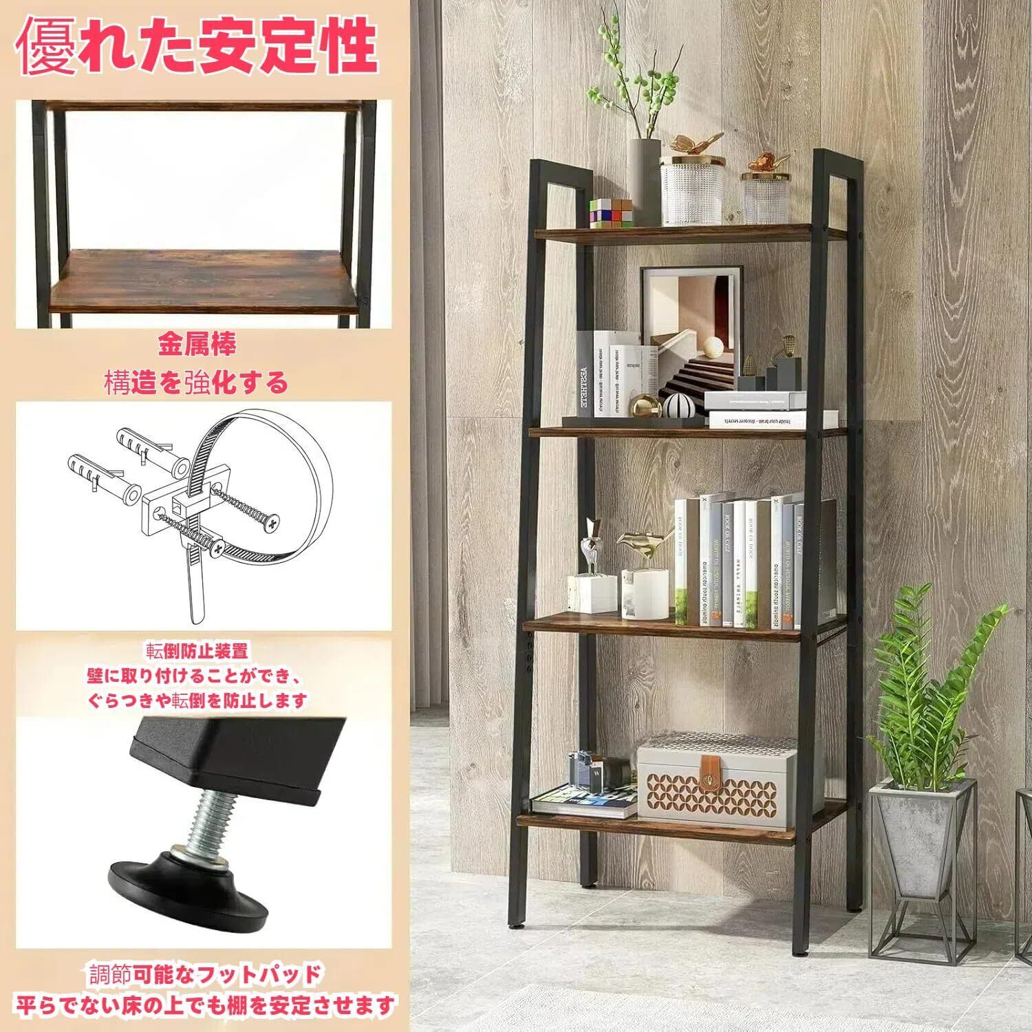 【4段式本棚収納ラック】: フレームは、高密度塗装コーティングを施した頑丈なスチール製で、耐久性があり、防錆性があり、本などの重い荷物を安定してサポートするための重い積載容量があります。各段の積載能力は最大25キロです。