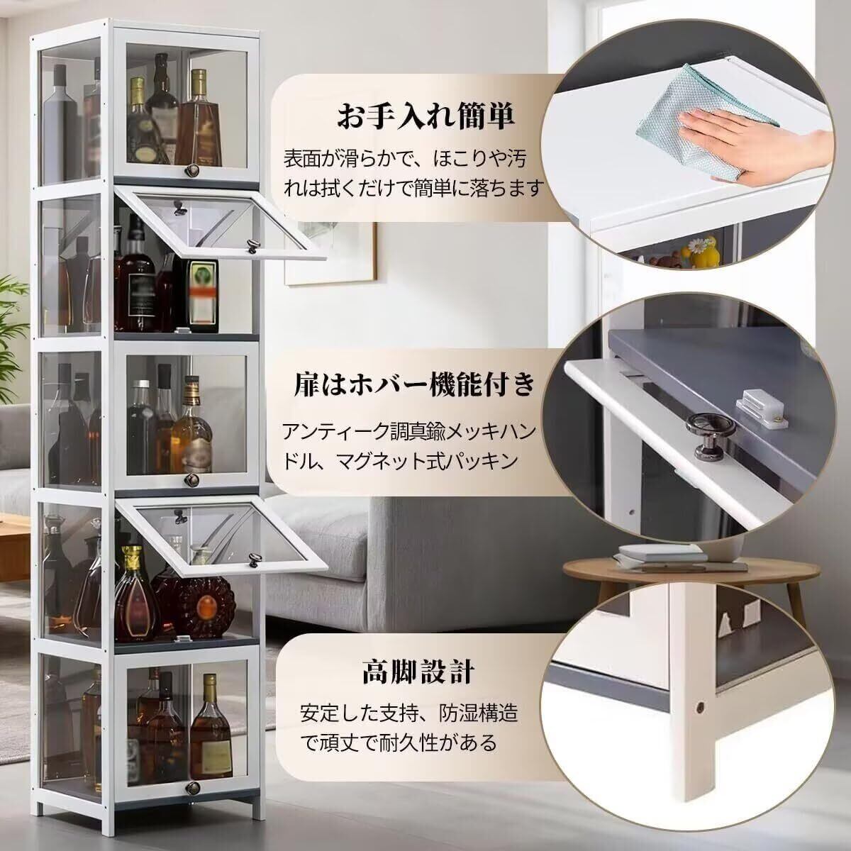【在庫処分】ウイスキー棚 ワインバーキャビネット 4段 密閉型/防塵型 幅40*奥行き32*高さ140.3cm 酒棚 ワインラック 酒類貯蔵ロッカー 透明アクリル お酒 収納 ウイスキーラック 落下防止 おしゃれ リビングルーム ダイニングルーム用 日本語説明書付き(ホワイト)